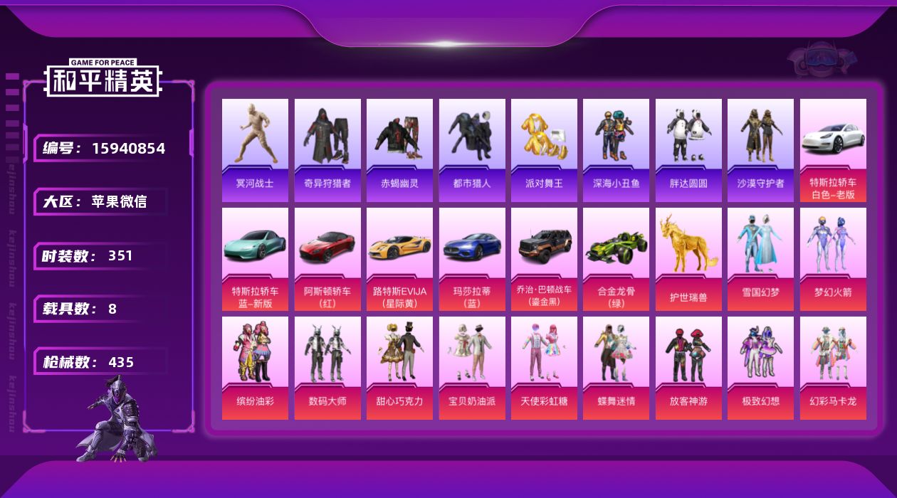 [15940854]极品素材男神号!!地铁满天赋!!!【店主推荐捡漏号!有二次可可直接换绑】苹果 微信-无敌战神框-36粉装-19特效枪-8载具-14粉色飞行器-177824热力值-31王牌印记-351套装-435枪皮【热门品类】:粉装-雪国幻梦,粉装-梦幻火箭,粉装-缤纷油彩,绝对防御上衣,套装-浪漫天命,套装-赤蝎幽灵,套装-都市猎人,套装-冥河战士,套装-派对舞王,套装-深海小丑鱼,套装-小丑鱼,套装-奇异狩猎者,角色-军刀雅典娜,套装-胖达圆圆,套装-沙漠守护者,套装-龟仙人,套装-潮萌小黄鸭,套装-暗影哥特,套装-浪漫波比,套装-粉红小猪【粉色套装】:粉装-数码大师,粉装-甜心巧克力,粉装-宝贝奶油派,粉装-天使彩虹糖,粉装-雪国幻梦,粉装-蝶舞迷情,粉装-梦幻火箭,粉装-缤纷油彩,粉装-放客神游,粉装-极致幻想,粉装-幻彩马卡龙,粉装-俏皮狐尾,粉装-苍蓝魅影,粉装-冰霜白皇,粉装-炙焰红王,粉装-香水柠檬,粉装-暗翼战神,粉装-星之彼岸,粉装-馨动时刻,粉装-蜜桃特工,粉装-蝶舞蔷薇,角色-洛天依,角色-2号机款机体服,粉装-蓝莓炮弹,粉装-甜心娃娃,粉装-精灵娃娃,粉装-酣梦娃娃,粉装-橘柚倾心,粉装-紫电风暴,粉装-筑梦精灵,角色-复仇流浪者,粉装-旋转彩虹,粉装-天星战神,角色-猩猩队长,角色-千金淑猫,粉装-星穹咏叹调【粉色枪皮等级】:AKM-炫紫旋律(七级),SCAR-L-青春物语(七级),SCAR-L-金蛇镇世(三级),M416-五爪金龙(七级),M416-心之恋语(四级),GROZA-香水柠檬(六级),AUG-许七安(四级),AUG-暖羊咩咩(五级),UMP45-恐龙拽拽(七级),Vector-环太平洋(七级),Kar98K-巳巳如意(五级),M24-镜域双华(三级),AWM-橘柚倾心(六级),Mk14-盛世惊鸿(三级),AMR-智耀战神(七级),M249-蓝莓炮弹(六级),DP-28-豹影疾电(五级),MG3-洛神天依(六级),破片手榴弹-瓶中星球(七级)【粉色载具】:特斯拉Model 3(珍珠白),特斯拉Roadster(水滴蓝),阿斯顿马丁DBS(红),路特斯EVIJA(星际黄),玛莎拉蒂Ghibli(蓝),乔治巴顿战车(鎏金黑),合金龙骨(绿),护世瑞兽【粉色枪皮】:AKM-炫紫旋律,SCAR-L-青春物语,SCAR-L-金蛇镇世,M416-五爪金