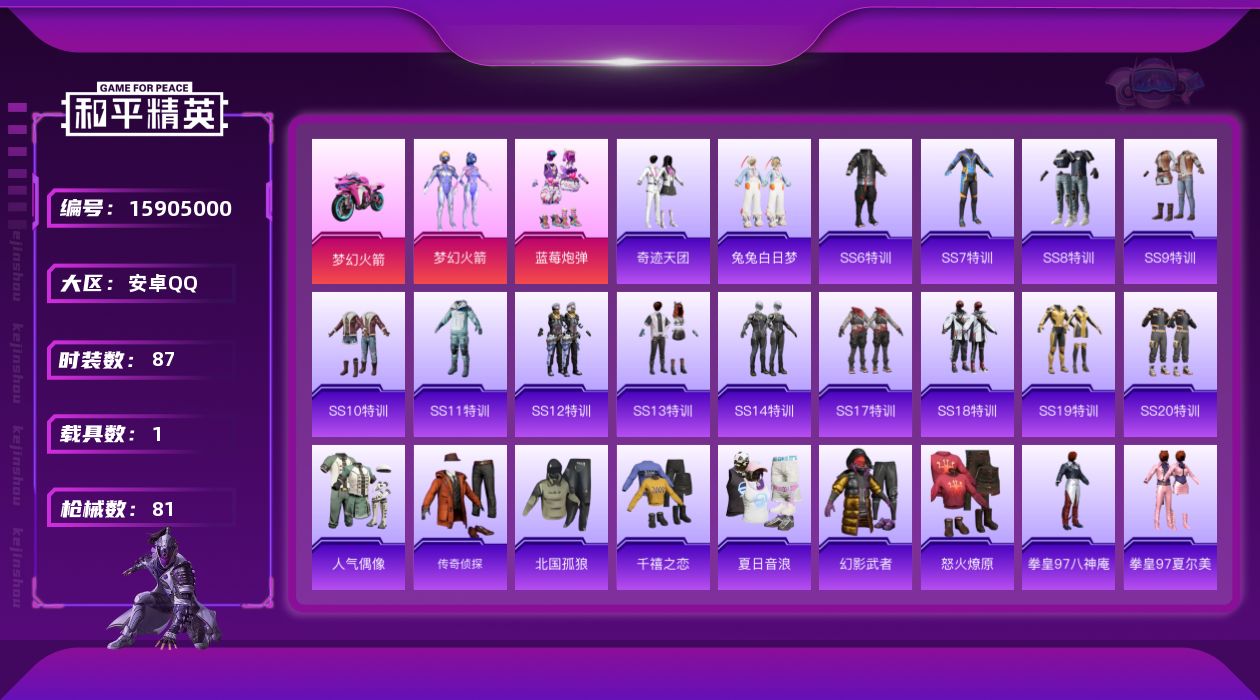 [15905000]【特价出售/店主推荐】安卓 手Q-2粉装-0特效枪-1载具-1粉色飞行器-25985热力值-1王牌印记-87套装-81枪皮 【热门品类】:粉装-梦幻火箭 【粉色套装】:粉装-梦幻火箭,粉装-蓝莓炮弹 【粉色载具】:双人摩托-梦幻火箭 【粉色飞行器】:梦幻火箭飞行器 【粉色降落伞】:春暖花开降落伞,梦幻火箭降落伞,伏魔团降落伞,筑梦精灵降落伞,甜梦小狐降落伞,炙焰牛王降落伞,星夜魔法师降落伞,异瞳寒姬降落伞 【稀有枪皮】:AKM-夜灯,AKM-彩虹符号,AKM-灼热熔岩,AKM-破晓战魂,AKM-筑梦精灵,M16A4-夜灯,M16A4-幻世战舞者,M16A4-红色方程式,SCAR-L-兔兔白日梦,SCAR-L-碧影闪光,SCAR-L-红色方程式,M416-夜灯,M416-红色方程式,M416-蓝色火焰,GROZA-异彩先驱,GROZA-春暖花开,GROZA-紫翼圣骑,AUG-耀粉歌者,QBZ-飞驰魅影,M762-拳皇97,M762-牛气冲天,UZI-古堡领主,UMP45-夜灯,UMP45-生命誓言,Vector-彩虹符号,Vector-生命誓言,汤姆逊-天降萌叽,汤姆逊-异彩先驱,MP5K-异彩先驱,P90-闪光银龙,P90-飞驰魅影,Kar98K-彩虹符号,Kar98K-梦幻火箭,Kar98K-飞驰魅影,M24-炫彩节奏,SKS-夜灯,SKS-炫彩节奏,VSS-碧影闪光,Mini14-异彩先驱,Mini14-星夜魔法师,Mini14-梦幻火箭,Mini14-炫彩节奏,Mini14-耀粉歌者,Mk14-暗星紫秘,S1897-碧影闪光,S1897-飞驰魅影,S12K-夜灯,DBS-甜心亚梦,M249-拳皇97,M249-破晓战魂,DP-28-甜心亚梦,DP-28-紫翼圣骑,MG3-幻世战舞者,P92-拳皇97 【其他套装】:套装-SS6特训,套装-SS7特训,套装-SS8特训,套装-SS9特训,套装-SS10特训,套装-SS11特训,套装-SS12特训,套装-SS13特训,套装-SS14特训,套装-SS17特训,套装-SS18特训,套装-SS19特训,套装-SS20特训,套装-人气偶像,套装-传奇侦探,套装-北国孤狼,套装-千禧之恋,套装-夏日音浪,套装-奇迹天团,套装-幻影武者,套装-怒火燎原,套装-拳皇97八神庵,套装-拳皇97夏尔美,套装-星光纪元,套装-暗金炫
