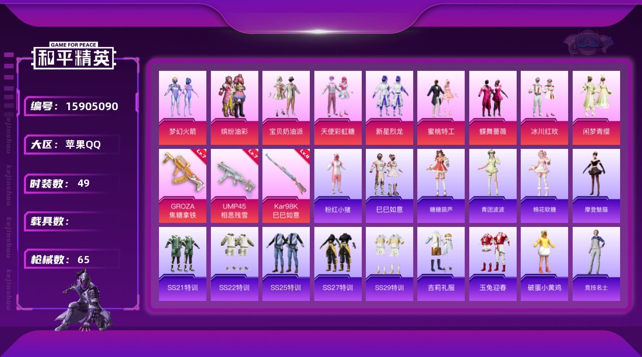 [15905090]【店主推荐捡漏号!可直接换绑】苹果 手Q-9粉装-3特效枪-0载具-1粉色飞行器-22777热力值-3王牌印记-49套装-65枪皮【热门品类】:粉装-梦幻火箭,粉装-缤纷油彩,套装-粉红小猪【粉色套装】:粉装-宝贝奶油派,粉装-天使彩虹糖,粉装-梦幻火箭,粉装-缤纷油彩,粉装-新星烈龙,粉装-蜜桃特工,粉装-蝶舞蔷薇,粉装-冰川红玫,粉装-闲梦青缨【粉色枪皮等级】:GROZA-焦糖拿铁(七级),UMP45-相思残雪(七级),Kar98K-巳巳如意(四级)【粉色枪皮】:GROZA-焦糖拿铁,UMP45-相思残雪,Kar98K-巳巳如意【粉色飞行器】:梦幻火箭飞行器