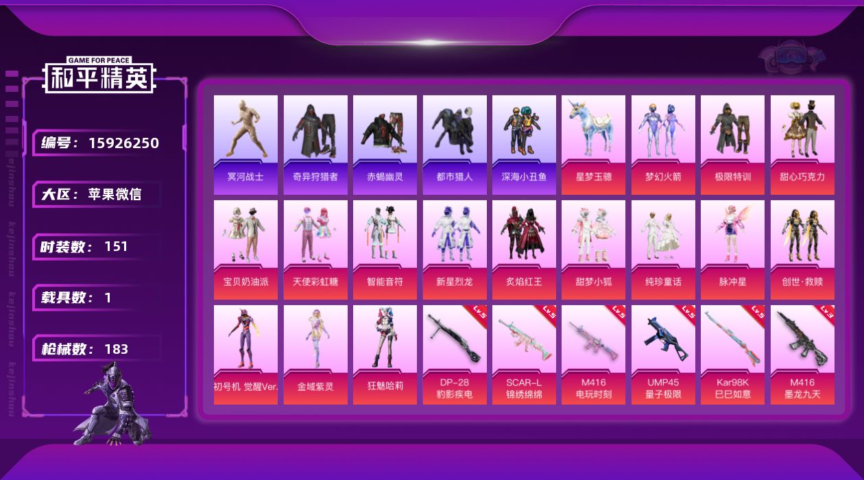 [15926250]苹果 微信-15粉装-6特效枪-1载具-5粉色飞行器-60479热力值-12王牌印记-151套装-183枪皮-连体王者V8-200皮1典藏1无双2珍品27传说1星传说