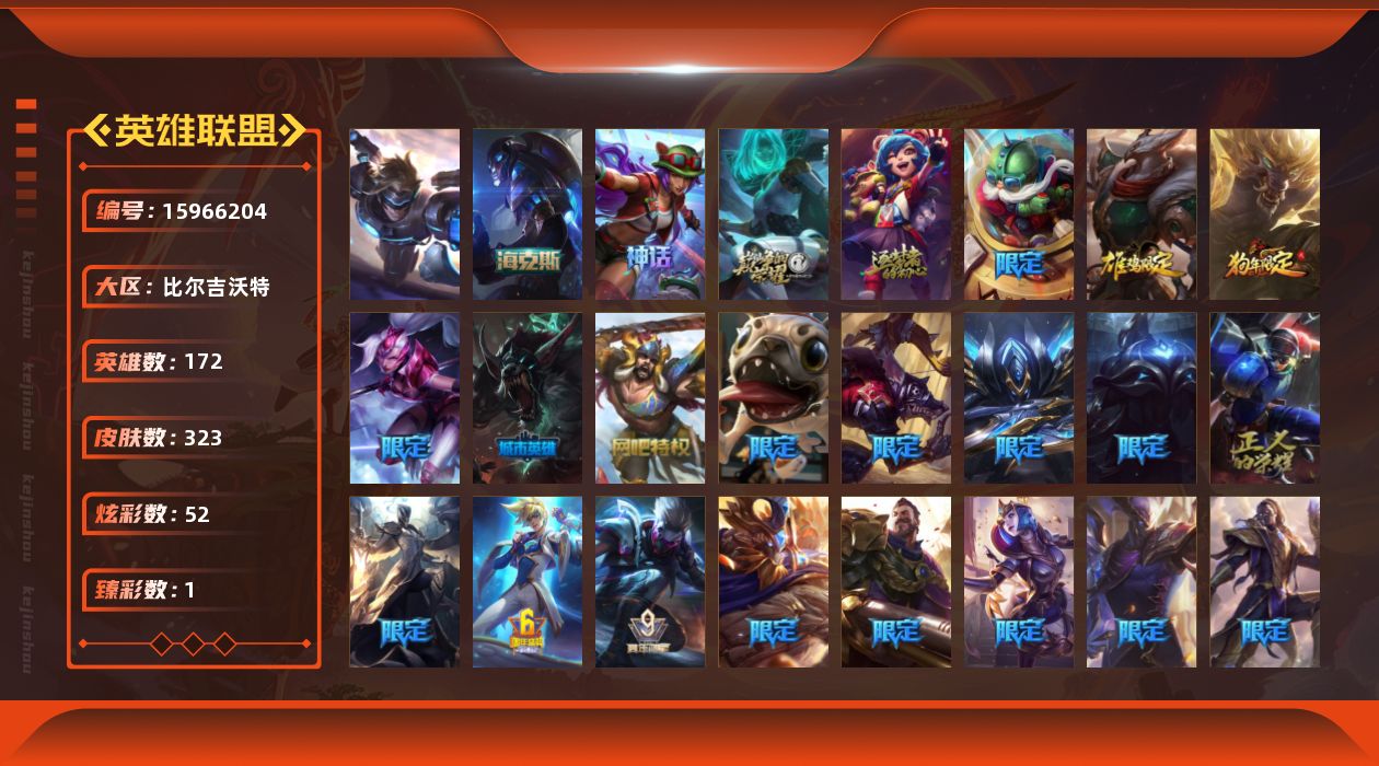[15966204]【店主推荐捡漏号】黑铁段位-172英雄-323皮肤-52炫彩-1终极-6神话-34限定-36传说-94史诗