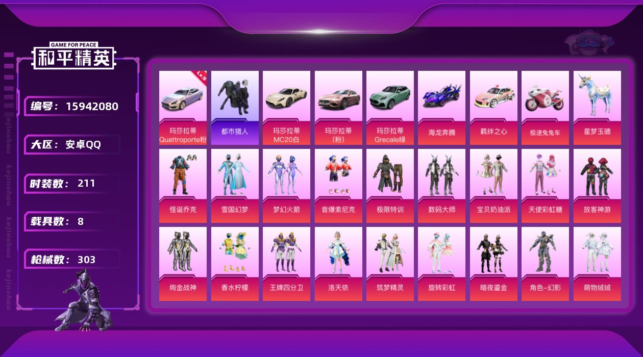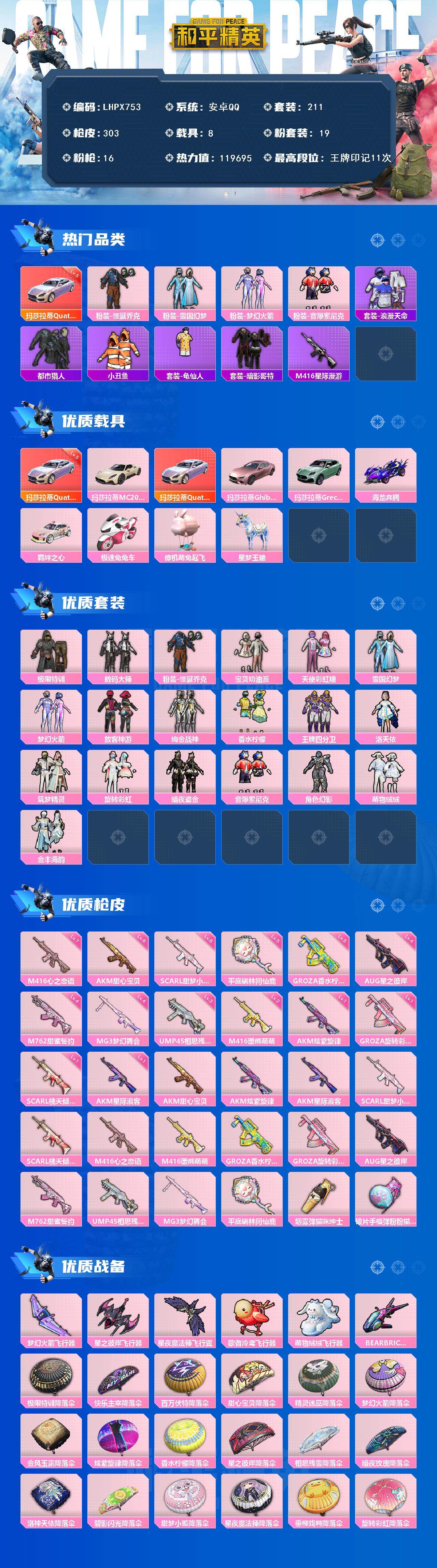 [15942080]【特价出售/店主推荐】安卓 手Q-19粉装-16特效枪-8载具-1僚机-6粉色飞行器-119695热力值-11王牌印记-211套装-303枪皮 【红色载具】:玛莎拉蒂Quattroporte(幻星粉)(五级) 【热门品类】:粉装-怪诞乔克,粉装-雪国幻梦,粉装-梦幻火箭,粉装-音爆索尼克,套装-浪漫天命,套装-都市猎人,套装-小丑鱼,套装-龟仙人,套装-暗影哥特,M416-星际漫游 【粉色套装】:粉装-极限特训,粉装-数码大师,粉装-怪诞乔克,粉装-宝贝奶油派,粉装-天使彩虹糖,粉装-雪国幻梦,粉装-梦幻火箭,粉装-放客神游,粉装-绚金战神,粉装-香水柠檬,粉装-王牌四分卫,角色-洛天依,粉装-筑梦精灵,粉装-旋转彩虹,粉装-暗夜鎏金,粉装-音爆索尼克,角色-幻影,粉装-萌物绒绒,粉装-金丰海韵 【粉色枪皮等级】:AKM-甜心宝贝(六级),AKM-炫紫旋律(一级),AKM-星际浪客(一级),SCAR-L-甜梦小狐(六级),SCAR-L-桃夭倾城(一级),M416-心之恋语(七级),M416-暖熊萌萌(二级),GROZA-香水柠檬(五级),GROZA-旋转彩虹(一级),AUG-星之彼岸(四级),M762-甜蜜誓约(四级),UMP45-相思残雪(三级),MG3-梦幻舞会(四级),平底锅-林间仙鹿(五级) 【粉色载具】:玛莎拉蒂MC20(星石白),玛莎拉蒂Quattroporte(幻星粉),玛莎拉蒂Ghibli(粉),玛莎拉蒂Grecale(薄荷绿),海龙奔腾,羁绊之心,极速兔兔车,僚机-萌兔起飞,星梦玉骢 【粉色枪皮】:AKM-甜心宝贝,AKM-炫紫旋律,AKM-星际浪客,SCAR-L-甜梦小狐,SCAR-L-桃夭倾城,M416-心之恋语,M416-暖熊萌萌,GROZA-香水柠檬,GROZA-旋转彩虹,AUG-星之彼岸,M762-甜蜜誓约,UMP45-相思残雪,MG3-梦幻舞会,平底锅-林间仙鹿,烟雾弹-猫咪绅士,破片手榴弹-粉粉猫爪 【粉色飞行器】:梦幻火箭飞行器,星之彼岸飞行器,星夜魔法师飞行翼,歌者泠鸢飞行器,萌物绒绒飞行器,BEARBRICK飞行器 【粉色降落伞】:极限特训降落伞,快乐主宰降落伞,百万伏特降落伞,甜心宝贝降落伞,精灵迷巫降落伞,梦幻火箭降落伞,金风玉露降落伞,炫紫旋律降落伞,香水柠檬降落伞,星之彼岸降落伞,相思残雪降落伞,暗夜玫瑰降落伞,洛神天