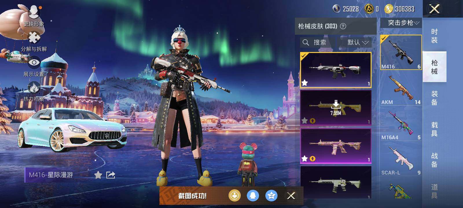 M416-星际漫游,AKM-百万伏特,AUG-魔法学院,M762-瑞龙福将,M24-香水柠檬