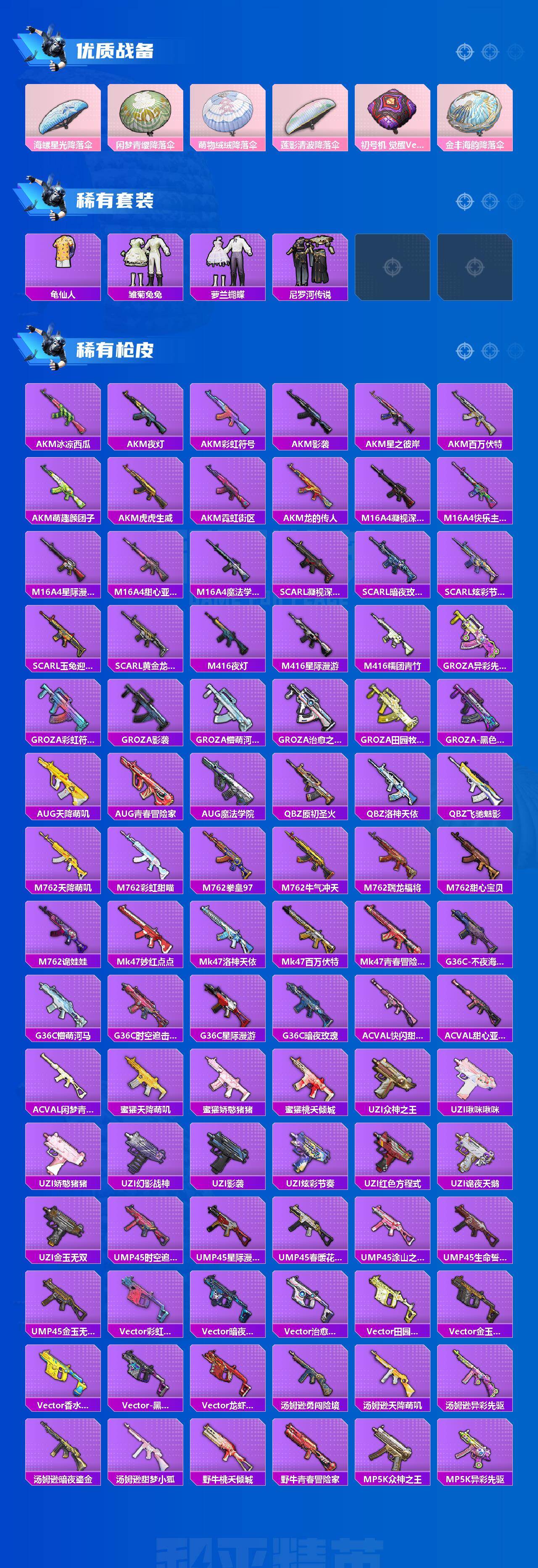 - [16511851]【店主推荐捡漏号】165m总资产-180k哈伏币-60烽火等级-黑鹰-23战场等级-上等兵 【干员外观】:红狼-蚀金玫瑰,蜂医-送葬人·无题密令,深蓝-不破誓约,红狼-电锯惊魂,露娜-金牌射手 【近战皮肤】:近战-北极星,近战-黑鹰 【传说外观】:M4A1突击步枪-蚀金玫瑰,M4A1突击步枪-阿米娅,ASh-12战斗步枪-鹅鸭杀,SG552突击步枪-运动员,AK-12突击步枪-特斯拉线圈,SCAR-H战斗步枪-启航,G3战斗步枪-骑士,CAR-15突击步枪-阿米娅,腾龙突击步枪-捞点薯条,K437突击步枪-北极星,KC17突击步枪-电锯惊魂,UZI冲锋枪-特斯拉线圈,SR-3M紧凑突击步枪-特斯拉线圈,勇士冲锋枪-能天使-午夜邮差,QCQ171冲锋枪-北极星,QCQ171冲锋枪-鹅鸭杀,725双管霰弹枪-送葬人-无题密令,M250通用机枪-骑士之心,QJB201轻机枪-鹅鸭杀,AWM狙击步枪-捞点薯条,93R-捞点薯条,复合弓-黑·天际线 【史诗外观】:QBZ95-1突击步枪-曙光,ASh-12战斗步枪-无极限,M16A4突击步枪-竞赛选手,AUG突击步枪-蝮蛇,M7战斗步枪-百步穿杨,SG552突击步枪-深海恐惧,SCAR-H战斗步枪-囚徒,G3战斗步枪-流沙送葬,AS Val突击步枪-百步穿杨,腾龙突击步枪-无垢,腾龙突击步枪-猎鳄行动,K437突击步枪-守护者,MP5冲锋枪-深海恐惧,MP5冲锋枪-战术竞备,MP5冲锋枪-竞技风,Vector冲锋枪-阿萨拉文明,Vector冲锋枪-猎鳄行动,Vector冲锋枪-百步穿杨,Vector冲锋枪-异域战争,SR-3M紧凑突击步枪-荒野求生,SR-3M紧凑突击步枪-战术竞备,勇士冲锋枪-深海恐惧,勇士冲锋枪-工业狂潮,MP7冲锋枪-无垢,MP7冲锋枪-守护者,S12K霰弹枪-曙光,PKM通用机枪-蝮蛇,PKM通用机枪-荒野求生,M250通用机枪-囚徒,Mini-14射手步枪-守护者,SVD狙击步枪-阿萨拉工艺,SVD狙击步枪-荒野求生,PSG-1射手步枪-无垢,SV-98狙击步枪-林中猎手,SV-98狙击步枪-囚徒,M700狙击步枪-竞技风,M700狙击步枪-蝮蛇,M700狙击步枪-百步穿杨,M700狙击步枪-哈夫克警备,AWM狙击步枪-无极限,AWM狙击步枪-流沙送葬,复合弓-守护者 【稀有外观】:M1014霰弹枪