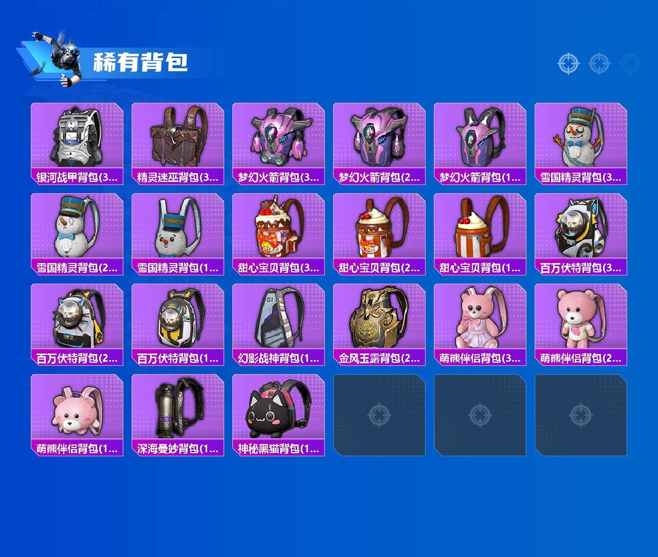 AKM-甜心宝贝,AKM-炫紫旋律,AKM-星际浪客,SCAR-L-甜梦小狐,SCAR-L-桃夭倾城,M416-心之恋语,M416-暖熊萌萌,GROZA-香水柠檬,GROZA-旋转彩虹,AUG-星之彼岸,M762-甜蜜誓约,UMP45-相思残雪,MG3-梦幻舞会,平底锅-林间仙鹿,烟雾弹-猫咪绅士,破片手榴弹-粉粉猫爪