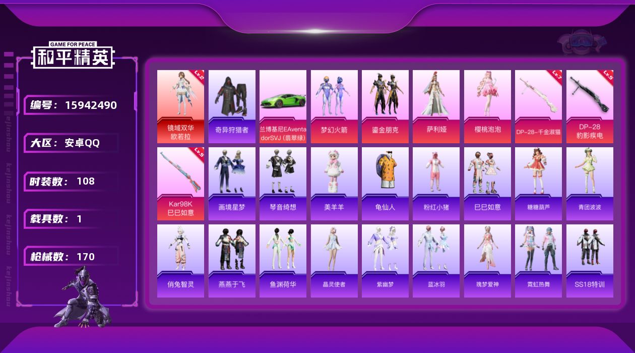 [15942490]【特价出售/店主推荐】安卓 手Q-1神装-4粉装-3特效枪-1载具-4粉色飞行器-5w热力值-7王牌印记-108套装-170枪皮 【红色神装等级】:镜域双华-欧若拉(二级) 【红色角色神装】:镜域双华-欧若拉 【热门品类】:粉装-梦幻火箭,套装-奇异狩猎者,套装-龟仙人,套装-粉红小猪 【粉色套装】:粉装-梦幻火箭,粉装-鎏金朋克,角色-萨利娅,角色-樱桃泡泡 【粉色枪皮等级】:Kar98K-巳巳如意(五级),DP-28-千金淑猫(七级),DP-28-豹影疾电(五级) 【粉色载具】:兰博基尼Aventador SVJ(翡翠绿) 【粉色枪皮】:Kar98K-巳巳如意,DP-28-千金淑猫,DP-28-豹影疾电 【粉色飞行器】:梦幻火箭飞行器,齐天大圣飞行器 【粉色降落伞】:梦幻火箭降落伞,太空嘟嘟降落伞,未来歌姬降落伞,变形金刚降落伞,鎏金朋克降落伞,星梦奇缘降落伞,千金淑猫降落伞,月影灵韵降落伞,星穹咏叹调降落伞,喜羊羊与灰太狼降落伞 【稀有套装】:套装-龟仙人,套装-巳巳如意,套装-糖糖葫芦,套装-青团波波,角色-俏兔智灵,套装-燕燕于飞,套装-鱼渊荷华,套装-晶灵使者,套装-紫幽梦,套装-蓝冰羽,角色-瑰梦爱神,套装-霓虹热舞,玩偶服-美羊羊,套装-画境星梦,套装-琴音绮想 【稀有枪皮】:AKM-彩虹符号,AKM-破晓战魂,M16A4-幻世战舞者,M16A4-甜心亚梦,M16A4-红色方程式,SCAR-L-炫彩节奏,SCAR-L-玉兔迎春,SCAR-L-红色方程式,SCAR-L-青丘仙客,SCAR-L-黄金龙骨,M416-糯团青竹,M416-红色方程式,M416-蓝色火焰,GROZA-2B战斗服款,GROZA-异彩先驱,GROZA-晶梦幻蝶,AUG-天降萌叽,AUG-耀粉歌者,AUG-月影灵韵,QBZ-彩虹符号,M762-天降萌叽,M762-瑞龙福将,Mk47-天之羽翼,G36C-暗夜玫瑰,G36C-炙焰牛王,G36C-星穹咏叹调,AC-VAL-天降萌叽,AC-VAL-甜心亚梦,蜜獾-垂柳戏鸭,蜜獾-天降萌叽,蜜獾-娇憨猪猪,ACE32-画境星梦,UZI-天降萌叽,UZI-娇憨猪猪,UZI-影袭,UZI-红色方程式,UZI-盛世惊鸿,UZI-月影灵韵,UMP45-涂山之恋,UMP45-生命誓言,UMP45-蓝色火焰,Vector-焰鹰斗篷,Vector-彩虹符