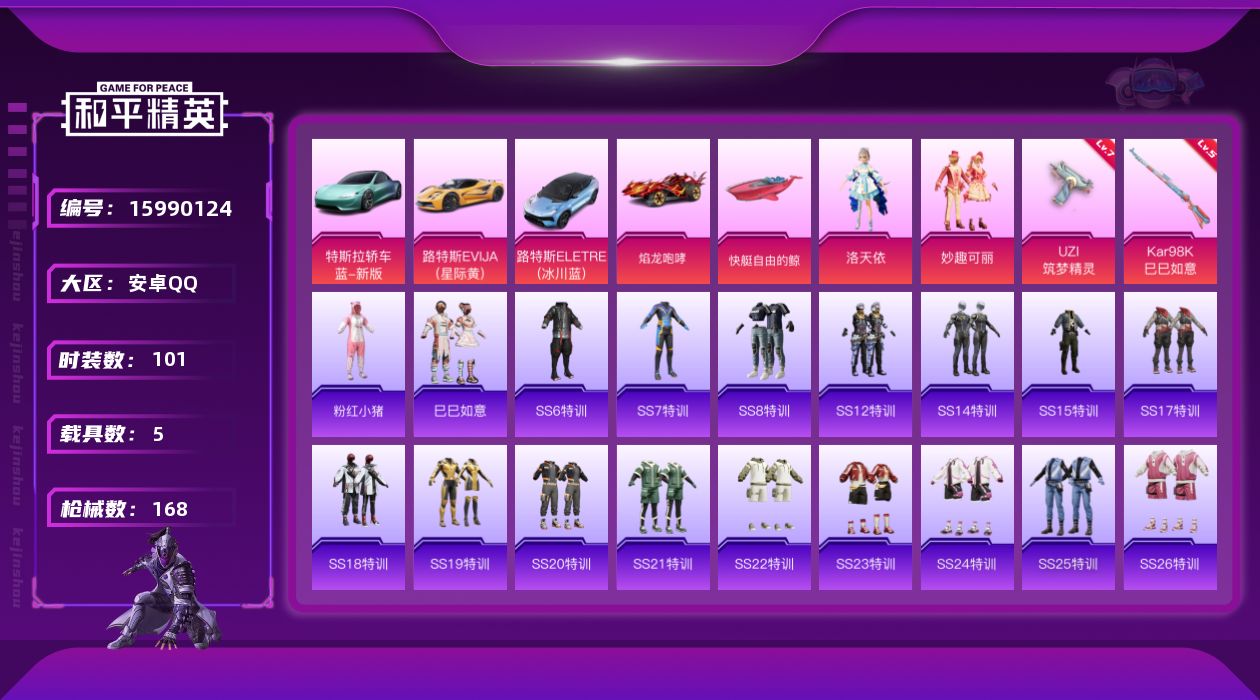 [15990124]【特价出售/店主推荐】安卓 手Q-2粉装-2特效枪-5载具-0粉色飞行器-52999热力值-12王牌印记-101套装-168枪皮 【热门品类】:套装-粉红小猪 【粉色套装】:角色-洛天依,粉装-妙趣可丽 【粉色枪皮等级】:UZI-筑梦精灵(七级),Kar98K-巳巳如意(五级) 【粉色载具】:特斯拉Roadster(水滴蓝),路特斯EVIJA(星际黄),路特斯ELETRE(冰川蓝),焰龙咆哮,快艇-自由的鲸 【粉色枪皮】:UZI-筑梦精灵,Kar98K-巳巳如意 【粉色降落伞】:未来战士降落伞,繁花小夜曲降落伞,洛神天依降落伞,歌者泠鸢降落伞,罪夜之冕降落伞 【稀有套装】:套装-巳巳如意,角色-月烬之祷 【稀有枪皮】:AKM-彩虹符号,AKM-灼热熔岩,AKM-破晓战魂,AKM-筑梦精灵,AKM-虎虎生威,AKM-霓虹街区,M16A4-幻世战舞者,M16A4-甜心亚梦,M16A4-红色方程式,M16A4-蓝色火焰,SCAR-L-炫彩节奏,SCAR-L-玉兔迎春,SCAR-L-红色方程式,SCAR-L-黄金龙骨,M416-月影鸳鸯,M416-糯团青竹,M416-红色方程式,M416-蓝色火焰,GROZA-异彩先驱,GROZA-恐龙拽拽,GROZA-懵萌河马,GROZA-田园牧歌,AUG-天降萌叽,AUG-纯梦嫁纱,AUG-耀粉歌者,QBZ-彩虹符号,QBZ-洛神天依,QBZ-飞驰魅影,M762-暗夜鎏金,M762-牛气冲天,M762-瑞龙福将,Mk47-妙红点点,Mk47-洛神天依,G36C-懵萌河马,G36C-炙焰牛王,G36C-星穹咏叹调,AC-VAL-天降萌叽,AC-VAL-彩虹甜喵,AC-VAL-甜心亚梦,蜜獾-天降萌叽,蜜獾-娇憨猪猪,UZI-天降萌叽,UZI-娇憨猪猪,UZI-炫彩节奏,UZI-红色方程式,UMP45-夜灯,UMP45-蓝色火焰,Vector-田园牧歌,汤姆逊-天降萌叽,汤姆逊-异彩先驱,汤姆逊-炫彩节奏,汤姆逊-耀粉歌者,野牛-机械英豪,MP5K-异彩先驱,P90-甜蜜旋律,P90-闪光银龙,P90-飞驰魅影,Kar98K-炫彩节奏,Kar98K-红色方程式,Kar98K-飞驰魅影,M24-炫彩节奏,AWM-不夜海上花,SKS-未来歌姬,SKS-炫彩节奏,VSS-彩虹符号,VSS-田园牧歌,Mini14-异彩先驱,Mini14-涂山之恋
