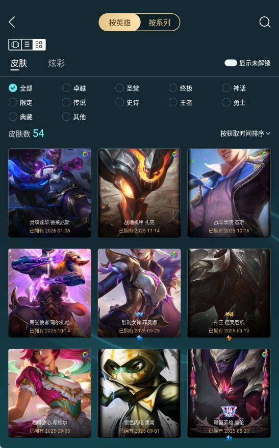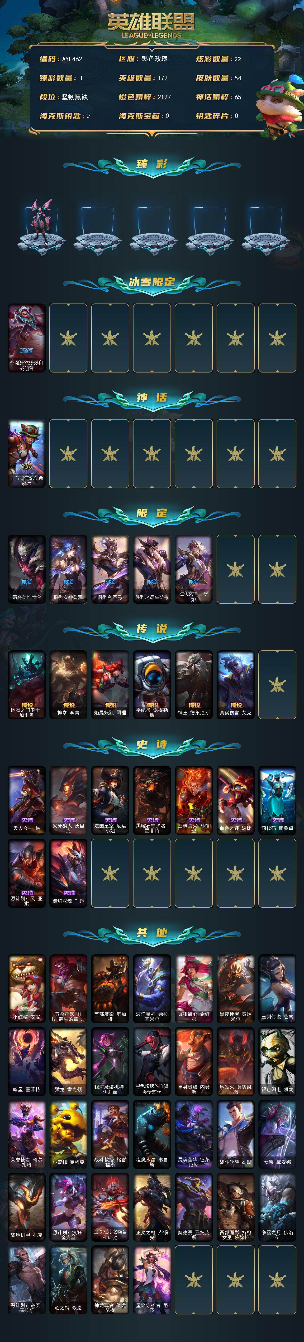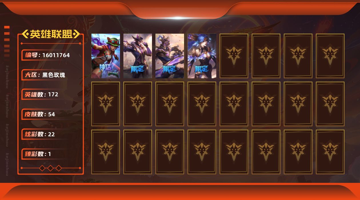 [16011764]未定级段位-172英雄-54皮肤-22炫彩-0终极-1神话-6限定-6传说-9史诗