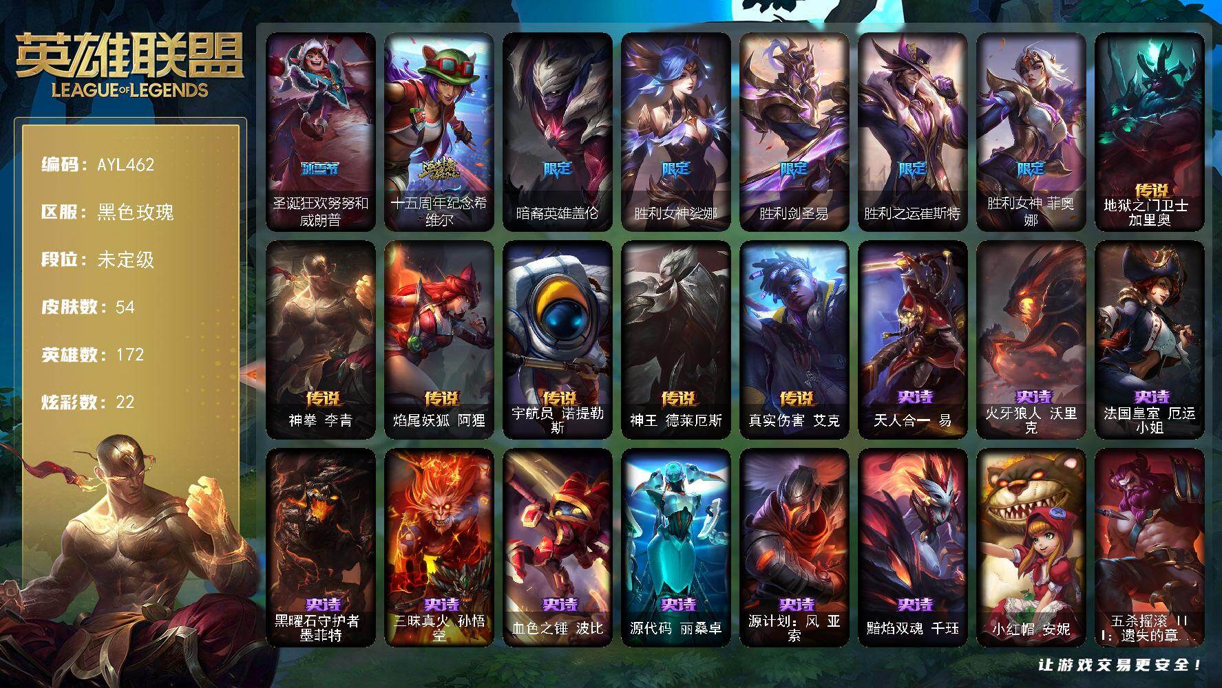 [16011764]未定级段位-172英雄-54皮肤-22炫彩-0终极-1神话-6限定-6传说-9史诗 【臻彩皮肤】:弹幕天使卡莎炽天使勇敢 【冰雪限定】:圣诞狂欢努努和威朗普 【神话皮肤】:十五周年纪念希维尔 【限定皮肤】:暗裔英雄盖伦,胜利女神娑娜,胜利剑圣易,胜利之运崔斯特,胜利女神菲奥娜 【传说皮肤】:地狱之门卫士加里奥,神拳李青,焰尾妖狐阿狸,宇航员诺提勒斯,神王德莱厄斯,真实伤害艾克 【史诗皮肤】:天人合一易,火牙狼人沃里克,法国皇室厄运小姐,黑曜石守护者墨菲特,三昧真火孙悟空,血色之锤波比,源代码丽桑卓,源计划风亚索,黯焰双魂千珏 【其他皮肤1】:小红帽安妮,五杀摇滚III遗失的章节奥拉夫,西部魔影厄加特,波江星神弗拉基米尔,咖啡甜心希维尔,黑夜使者泰达米尔,玉剑传说苍鸾,暗星墨菲特,猛龙雷克顿,银河魔装机神伊莉丝,黑色玫瑰假面舞会伊莉丝,单身贵族内瑟斯,地狱火莫德凯撒,银色闪电凯南,荣誉使者玛尔扎哈,小蜜蜂克格莫,战斗教授格雷福斯,夜魔水晶韦鲁斯,灵魂莲华德莱厄斯,战斗学院杰斯,女帝黛安娜,战地机甲扎克,源计划疯狂金克丝,五杀摇滚之噪音佛耶戈,正义之枪卢锡安,奥德赛亚托克斯,西部魔影持枪女巫莎弥拉,净雪之月俄洛伊,源计划逆流塞拉斯,心之钢永恩,神龙尊者炎龙瑟提,星之守护者尼菈