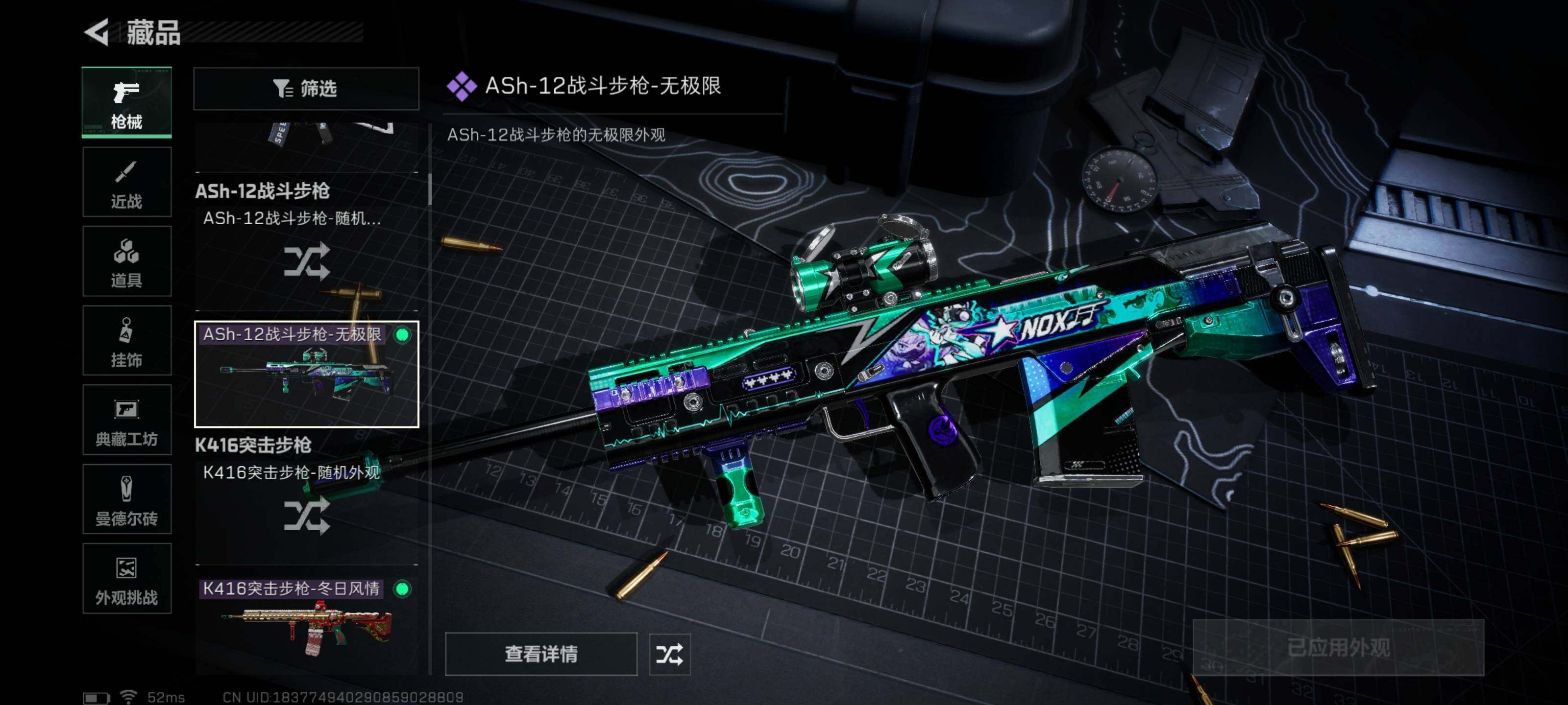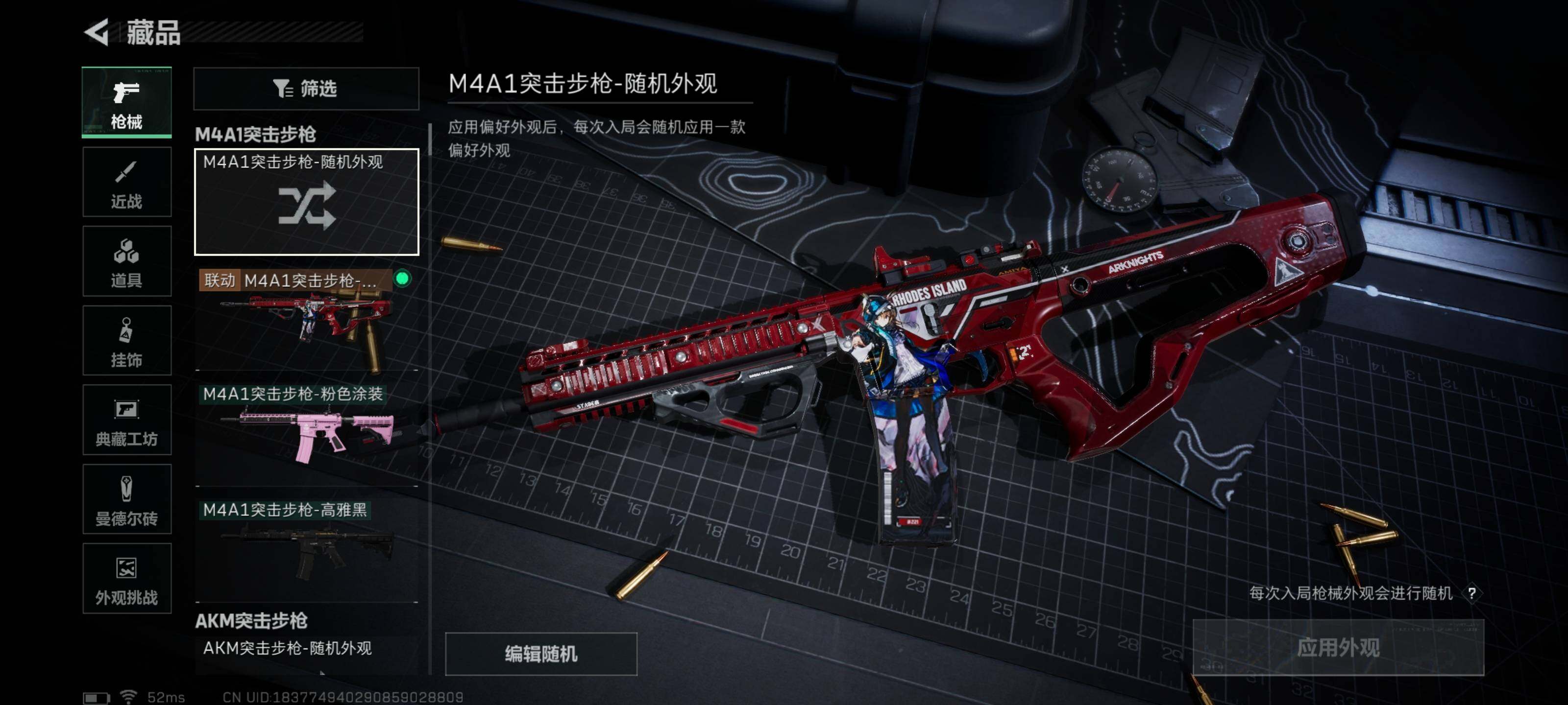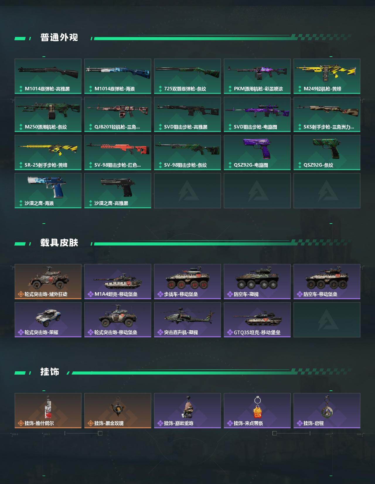 【稀有外观】:PTR-32突击步枪-花岗岩,AKM突击步枪-战术演练,AKM突击步枪-肃杀,QBZ95-1突击步枪-公平竞技,M7战斗步枪-捣蛋鬼,SCAR-H战斗步枪-荣耀列队,SCAR-H战斗步枪-黄昏,G3战斗步枪-战术演练,G3战斗步枪-主宰,K437突击步枪-生存指令,MK47突击步枪-精英联盟,MP5冲锋枪-弄臣,MP5冲锋枪-虎啸,MP5冲锋枪-哈夫克卫队,P90冲锋枪-黄昏,Vector冲锋枪-先锋,UZI冲锋枪-亚特兰蒂斯,SMG-45-行动开启,SMG-45冲锋枪-幻影结构,勇士冲锋枪-冰天雪地,MP7冲锋枪-钢铁之躯,M1014霰弹枪-幻影结构,S12K霰弹枪-战术演练,M250通用机枪-前沿科技,QJB201轻机枪-黄昏,QJB201轻机枪-哈夫克卫队,Mini-14射手步枪-荣耀列队,SKS射手步枪-弄臣,SR-25射手步枪-开拓,SR-9射手步枪-街头涂鸦,SV-98狙击步枪-星链科技,SV-98狙击步枪-哈夫克航天,SV-98狙击步枪-精英联盟,G18-星链科技,G18-哈夫克航天