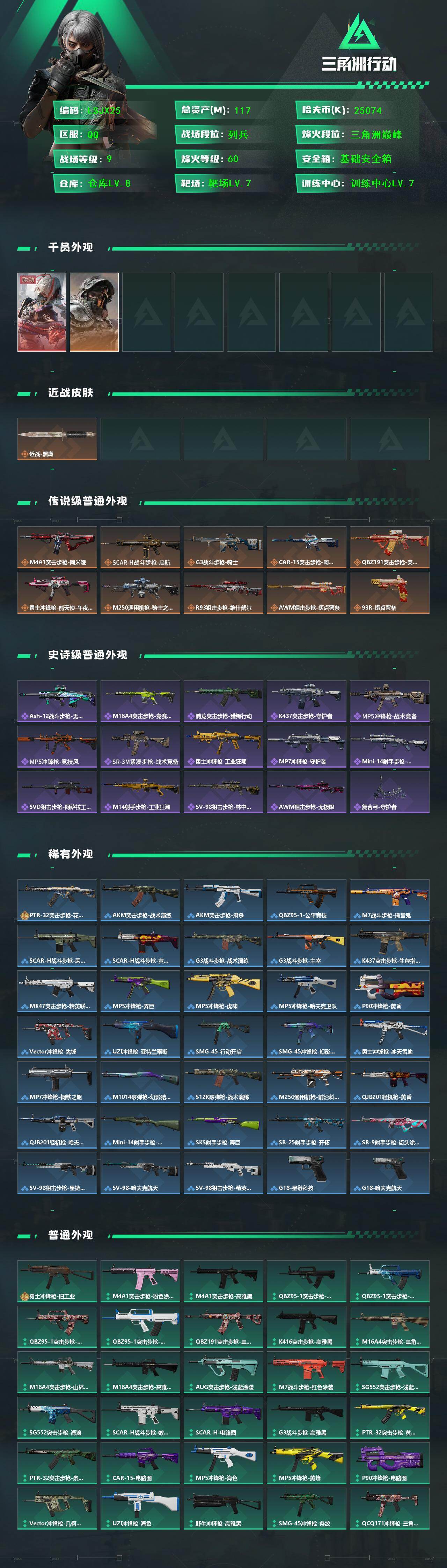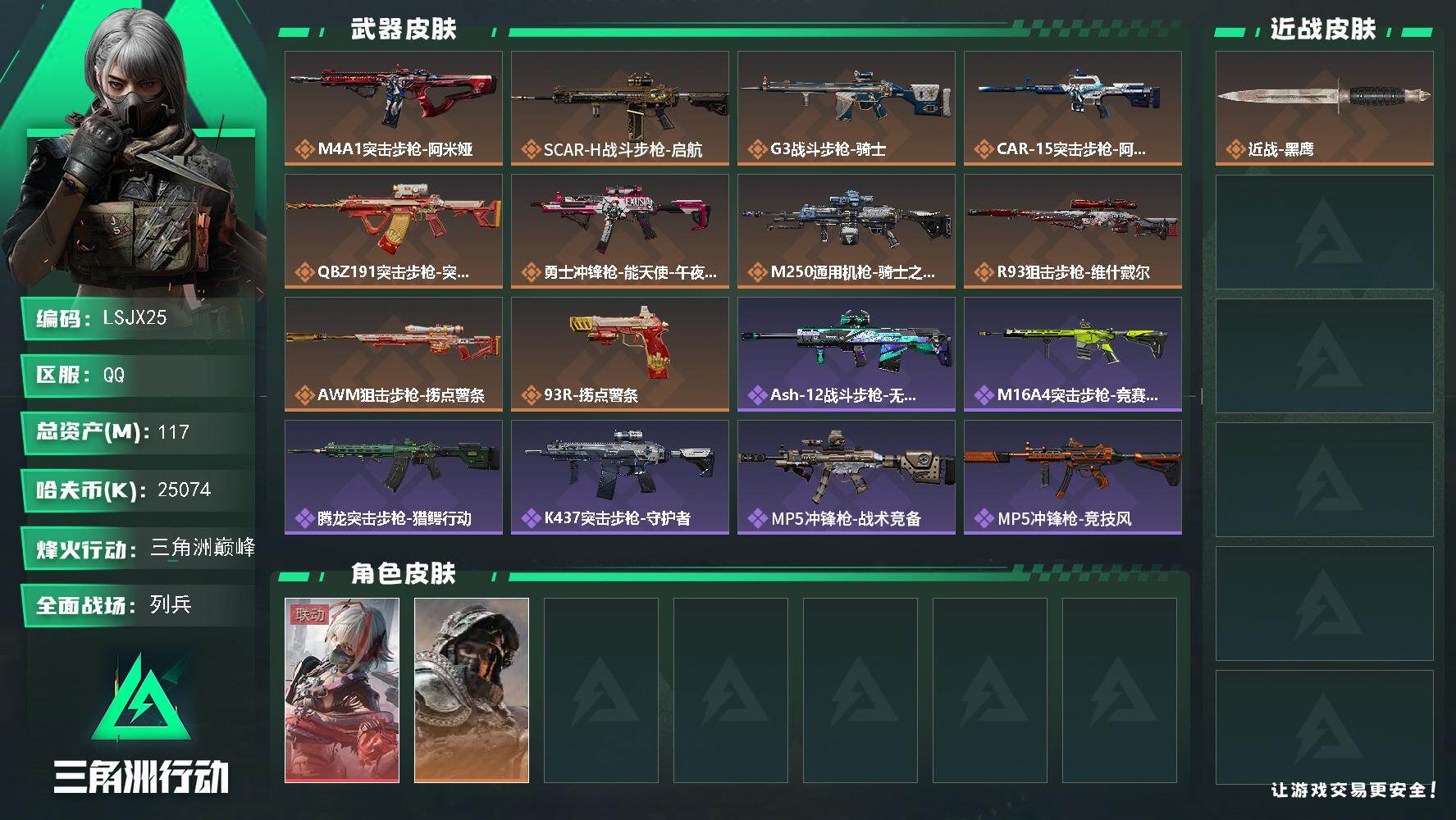 [15990110]【特价出售/店主推荐】117m总资产-25074k哈伏币-60烽火等级-三角洲巅峰-9战场等级-列兵 【干员外观】:骇爪-维什戴尔,深蓝-不破誓约 【近战皮肤】:近战-黑鹰 【传说外观】:M4A1突击步枪-阿米娅,SCAR-H战斗步枪-启航,G3战斗步枪-骑士,CAR-15突击步枪-阿米娅,腾龙突击步枪-捞点薯条,勇士冲锋枪-能天使-午夜邮差,M250通用机枪-骑士之心,R93狙击步枪-维什戴尔,AWM狙击步枪-捞点薯条,93R-捞点薯条 【史诗外观】:ASh-12战斗步枪-无极限,M16A4突击步枪-竞赛选手,腾龙突击步枪-猎鳄行动,K437突击步枪-守护者,MP5冲锋枪-战术竞备,MP5冲锋枪-竞技风,SR-3M紧凑突击步枪-战术竞备,勇士冲锋枪-工业狂潮,MP7冲锋枪-守护者,Mini-14射手步枪-守护者,SVD狙击步枪-阿萨拉工艺,M14射手步枪-工业狂潮,SV-98狙击步枪-林中猎手,AWM狙击步枪-无极限,复合弓-守护者 【稀有外观】:PTR-32突击步枪-花岗岩,AKM突击步枪-战术演练,AKM突击步枪-肃杀,QBZ95-1突击步枪-公平竞技,M7战斗步枪-捣蛋鬼,SCAR-H战斗步枪-荣耀列队,SCAR-H战斗步枪-黄昏,G3战斗步枪-战术演练,G3战斗步枪-主宰,K437突击步枪-生存指令,MK47突击步枪-精英联盟,MP5冲锋枪-弄臣,MP5冲锋枪-虎啸,MP5冲锋枪-哈夫克卫队,P90冲锋枪-黄昏,Vector冲锋枪-先锋,UZI冲锋枪-亚特兰蒂斯,SMG-45-行动开启,SMG-45冲锋枪-幻影结构,勇士冲锋枪-冰天雪地,MP7冲锋枪-钢铁之躯,M1014霰弹枪-幻影结构,S12K霰弹枪-战术演练,M250通用机枪-前沿科技,QJB201轻机枪-黄昏,QJB201轻机枪-哈夫克卫队,Mini-14射手步枪-荣耀列队,SKS射手步枪-弄臣,SR-25射手步枪-开拓,SR-9射手步枪-街头涂鸦,SV-98狙击步枪-星链科技,SV-98狙击步枪-哈夫克航天,SV-98狙击步枪-精英联盟,G18-星链科技,G18-哈夫克航天 【普通外观】:勇士冲锋枪-旧工业,M4A1突击步枪-粉色涂装,M4A1突击步枪-高雅黑,QBZ95-1突击步枪-高雅黑,QBZ95-1突击步枪-海浪,QBZ95-1突击步枪-三角洲力量,QBZ95-1突击步枪-海色,QBZ1
