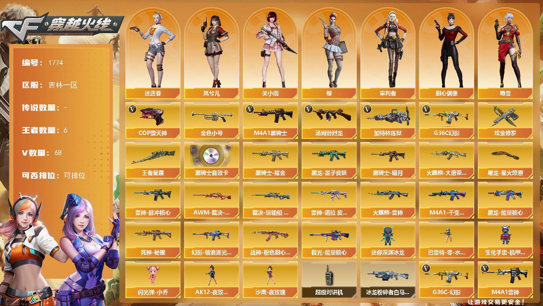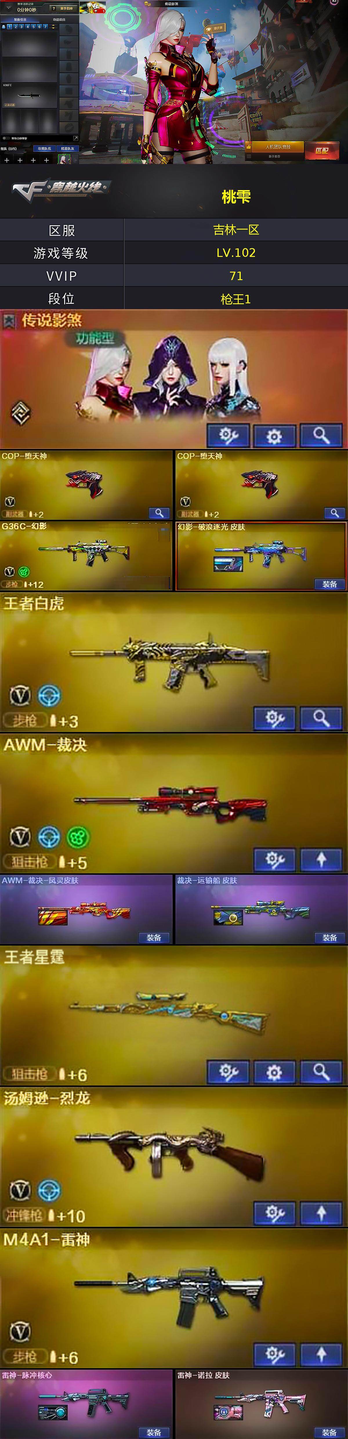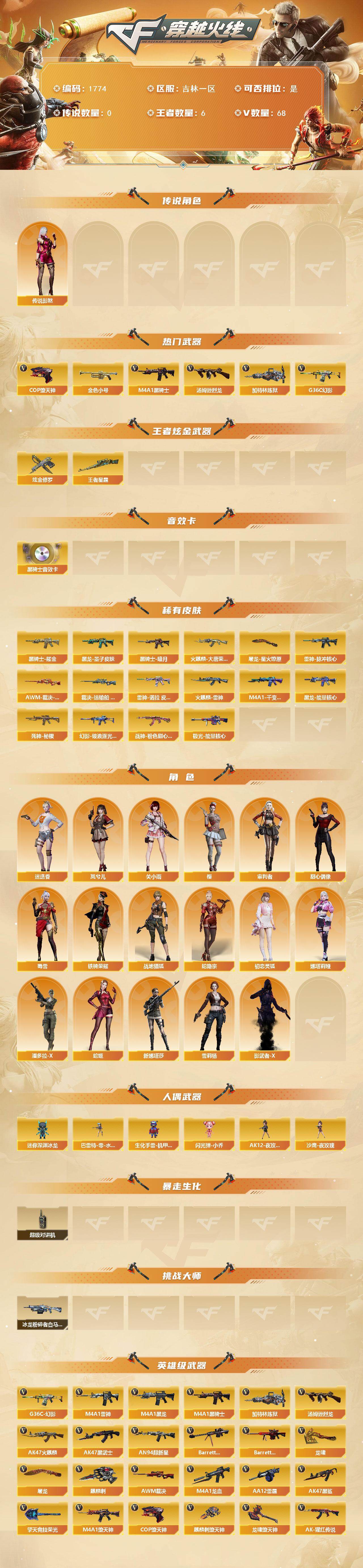 [16013114]吉林一区-68V-6王者-1炫金 【传说角色】:传说影煞 【热门武器】:G36C-幻影,金色小号,M4A1-黑骑士,汤姆逊-烈龙,加特林-炼狱*3,COP-堕天神*2 【王者炫金武器】:王者星霆,炫金修罗 【音效卡】:M4A1-黑骑士音效卡 【皮肤】:AWM-裁决-凤灵皮肤,裁决-运输船 皮肤,雷神-脉冲核心,雷神-诺拉 皮肤,火麒麟-雷神,火麒麟-大唐荣光,M4A1-千变-孔明皮肤,黑龙-能量核心,黑龙-墨子皮肤,黑骑士-暗月,黑骑士耀金皮肤,死神-秘银,幻影-破浪逐光 皮肤,战神-粉色甜心皮肤*2,极光-能量核心,屠龙-星火燎原 【角色】:樱,迷迭香,关小雨,岚兮儿,审判者,战地猎狐,蛇隐宗,初恋灵狐,娜塔莉娅,潘多拉-X,蛇姬,甜心偶像,蜀雪,铁骑荣耀,新娜塔莎,雪莉杨,影武者-X 【人偶武器】:巴雷特-零-水下丽影*2,迷你深渊冰龙,生化手雷-机甲核心,闪光弹-小乔,AK12-夜玫瑰,沙鹰-夜玫瑰 【暴走生化】:超级对讲机 【挑战大师】:冰龙粉碎者-白马银枪 【英雄级武器】:AK47-火麒麟,M4A1-黑龙,M4A1-雷神,M4A1-黑骑士,AK47-黑武士,AN94-超新星,AK47-黑鲨,M4A1-龙血,M4A1-堕天神,G36C-幻影,QBZ03-独角-III,王者之武-觉醒版,王者之势-觉醒版,AK-47-猩红传说*9,AK47-B-战神,王者白虎-觉醒版,Barrett-毁灭,Barrett-极光,AWM-裁决,王者之力-觉醒版,加特林-炼狱*3,汤姆逊-烈龙,AA-12-雷霆,COP-堕天神*2,屠龙,龙啸*2,麒麟刺-堕天神,麒麟刺,擎天-竞技荣光,龙啸-堕天神,高爆手雷-堕天神*6,高爆手雷-幻灵,闪光弹-堕天神*6,烟雾弹-堕天神*6,M4A1-赤狱骑士 【道具】:XROCK炫彩背包,冰冰企鹅背包-猛男专用,奇洋探员-海龟背包,战舰背包,炫彩背包,背包-洛丽塔,虎牙炫彩背包,超级背包,女皇终结者-魔龙之吻,救世主-黑桃战神,绿色巨人,灵魂忍者*3,变异宝贝,妖姬,迷雾幽灵*3,生化弹匣,夺命之镰,防化服*3,金色流光-枪王排位*2,流光-再燃火线,审判者表情,防弹头盔*5,防弹衣*5,C4工具钳*5,手雷包*6 【特殊枪械】:1黑骑士,1烈龙,3炼狱