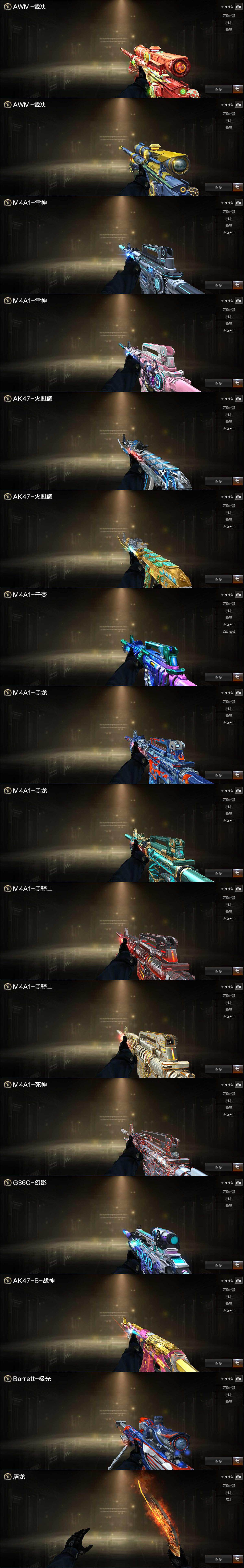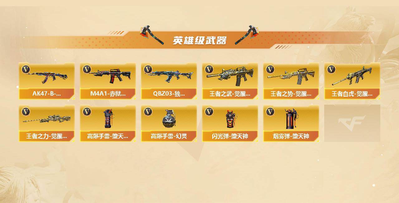 【英雄级武器】:AK47-火麒麟,M4A1-黑龙,M4A1-雷神,M4A1-黑骑士,AK47-黑武士,AN94-超新星,AK47-黑鲨,M4A1-龙血,M4A1-堕天神,G36C-幻影,QBZ03-独角-III,王者之武-觉醒版,王者之势-觉醒版,AK-47-猩红传说*9,AK47-B-战神,王者白虎-觉醒版,Barrett-毁灭,Barrett-极光,AWM-裁决,王者之力-觉醒版,加特林-炼狱*3,汤姆逊-烈龙,AA-12-雷霆,COP-堕天神*2,屠龙,龙啸*2,麒麟刺-堕天神,麒麟刺,擎天-竞技荣光,龙啸-堕天神,高爆手雷-堕天神*6,高爆手雷-幻灵,闪光弹-堕天神*6,烟雾弹-堕天神*6,M4A1-赤狱骑士