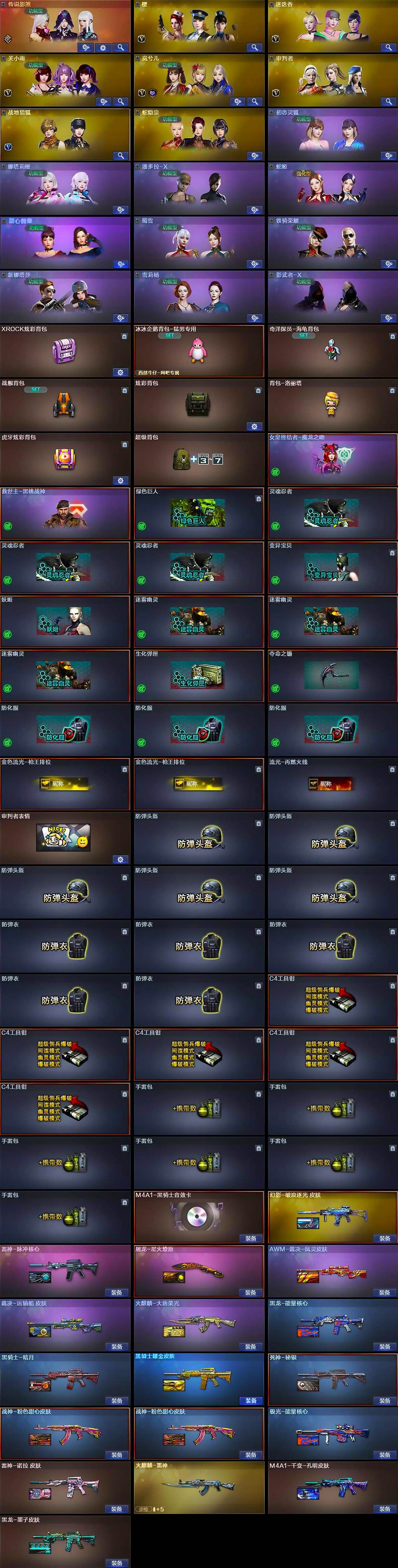 【道具】:XROCK炫彩背包,冰冰企鹅背包-猛男专用,奇洋探员-海龟背包,战舰背包,炫彩背包,背包-洛丽塔,虎牙炫彩背包,超级背包,女皇终结者-魔龙之吻,救世主-黑桃战神,绿色巨人,灵魂忍者*3,变异宝贝,妖姬,迷雾幽灵*3,生化弹匣,夺命之镰,防化服*3,金色流光-枪王排位*2,流光-再燃火线,审判者表情,防弹头盔*5,防弹衣*5,C4工具钳*5,手雷包*6