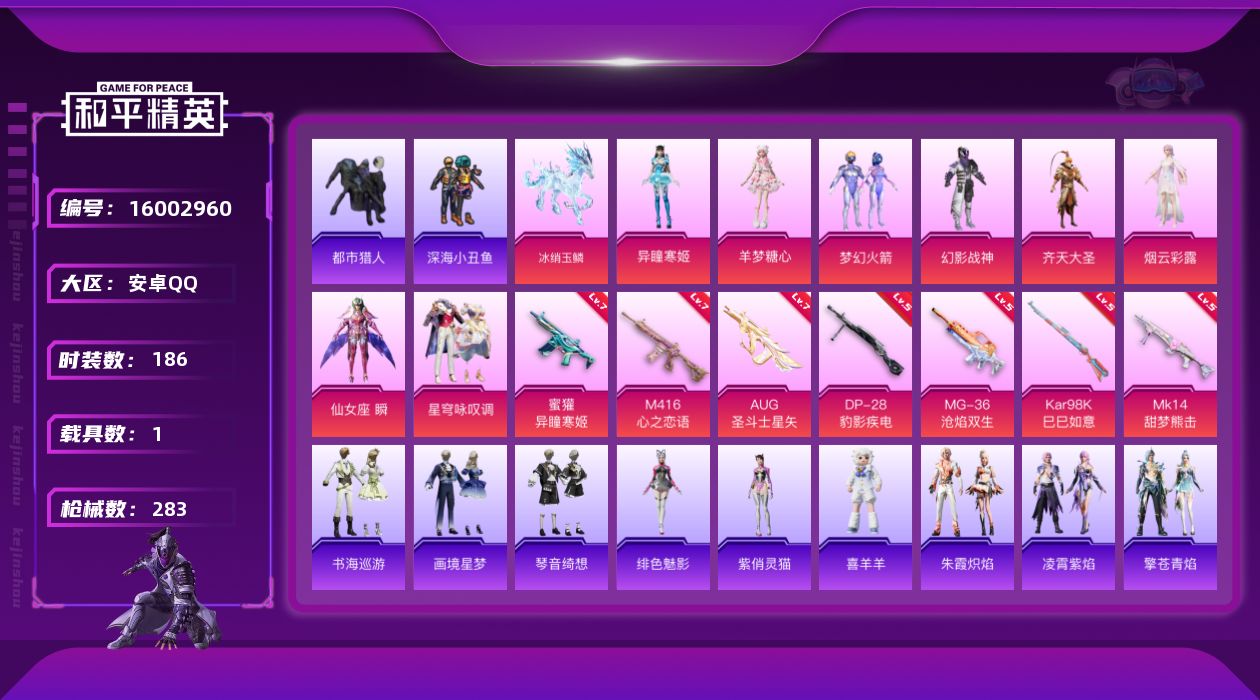 [16002960]地铁满天赋安卓 手Q-8粉装-7特效枪-1载具-2粉色飞行器-83725热力值-12王牌印记-186套装-283枪皮【热门品类】:粉装-梦幻火箭,套装-都市猎人,套装-深海小丑鱼,角色-军刀雅典娜,套装-金羽特工,套装-龟仙人,套装-粉红小猪,角色-Mark.06【粉色套装】:粉装-幻影战神,装-梦幻火箭,粉装-齐天大圣,角色-烟云彩露,角色-仙女座 瞬,粉装-星穹咏叹调,角色-羊梦糖心,角色-异瞳寒姬【粉色枪皮等级】:M416-心之恋语(七级),AUG-圣斗士星矢(七级),蜜獾-异瞳寒姬(七级),Kar98K-巳巳如意(五级),Mk14-甜梦熊击(五级),DP-28-豹影疾电(五级),MG-36-沧焰双生(五级)【粉色载具】:僚机-冰龙团团,冰绡玉鳞【粉色枪皮】:M416-心之恋语,AUG-圣斗士星矢,蜜獾-异瞳寒姬,Kar98K-巳巳如意,Mk14-甜梦熊击,DP-28-豹影疾电,MG-36-沧焰双生【粉色飞行器】:灵珠游龙飞行器