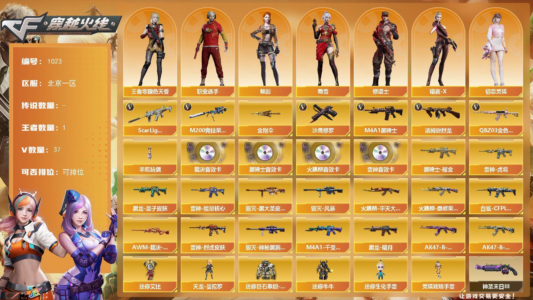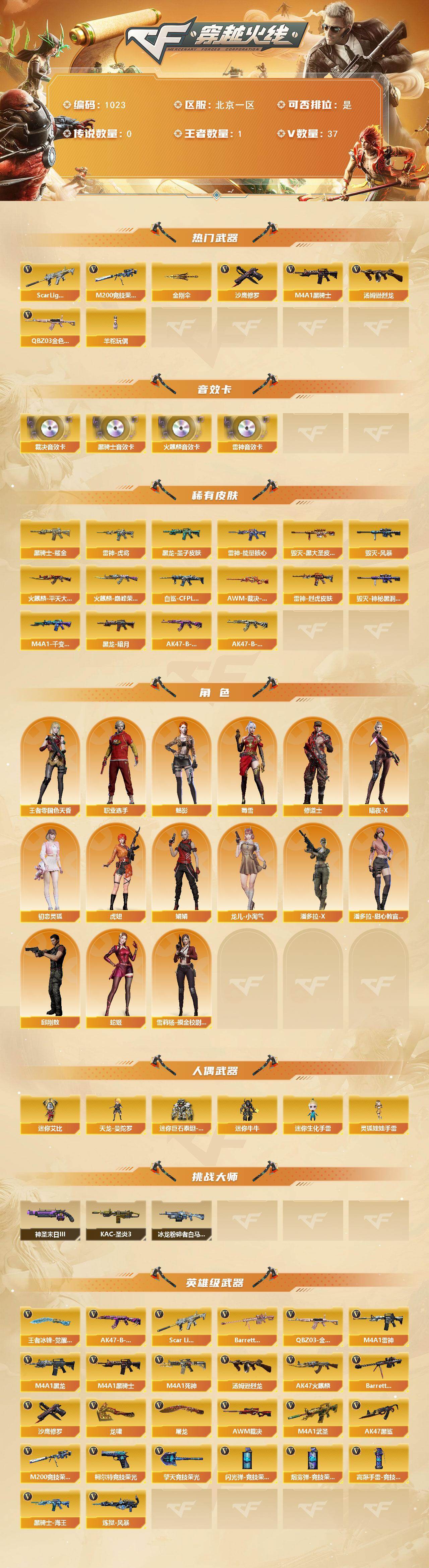 [16019964]北京一区-37V-1王者-0炫金 【热门武器】:QBZ03-金色蔷薇,Scar Light-白虎,M200-竞技荣光,M4A1-黑骑士,汤姆逊-烈龙,羊驼玩偶,沙鹰-修罗,金刚伞 【音效卡】:AK47-火麒麟音效卡,M4A1-雷神音效卡,M4A1-黑骑士音效卡,AWM-裁决音效卡 【皮肤】:白虎-白鲨-CFPLS23冠军,AWM-裁决-凤灵皮肤,雷神-能量核心,雷神-虎将,雷神-烈虎皮肤,火麒麟-平天大圣*2,火麒麟-巅峰荣耀,毁灭-黑大圣皮肤,毁灭-风暴*2,毁灭-神秘黑洞皮肤,M4A1-千变-孔明皮肤,黑龙-暗月*2,黑龙-墨子皮肤,黑骑士耀金皮肤,AK47-B-常胜将军-曹操,AK47-B-常胜将军-刘备 【角色】:魅影,王者-零-国色天香,修道士,暗夜-X,初恋灵狐,虎妞,娟娟,龙儿-小淘气,潘多拉-X,潘多拉-甜心教官,邱刚敖,蛇姬,蜀雪,雪莉杨-摸金校尉,职业选手 【人偶武器】:天龙-曼陀罗,迷你牛牛*2,迷你生化手雷,迷你艾比,迷你巨石泰坦-魔花研究所,灵狐娃娃手雷 【挑战大师】:冰龙粉碎者-白马银枪*3,KAC-圣炎切割者III,神圣爆裂者-末日III 【英雄级武器】:AK47-火麒麟,M4A1-黑龙*2,M4A1-雷神*2,M4A1-黑骑士,M4A1-死神,M4A1-武圣,AK47-黑鲨,Scar Light-白虎,QBZ03-金色蔷薇,黑骑士-海王,AK47-B-常胜将军,Barrett-毁灭,AWM-裁决,M200-竞技荣光,Barrett-金色蔷薇*2,炼狱-风暴,汤姆逊-烈龙,沙鹰-修罗,柯尔特-竞技荣光,屠龙,龙啸,擎天-竞技荣光,王者冰锋-觉醒版,高爆手雷-竞技荣光*2,闪光弹-竞技荣光*2,烟雾弹-竞技荣光*2 【道具】:XROCK炫彩背包,炫彩背包,超级背包*2,女皇终结者-魔龙之吻,绿色巨人,灵魂忍者,迷雾幽灵,夺命之镰,防化服*3,枪王排位29赛季金色流光,防弹头盔*3,防弹衣*3,C4工具钳*4,手雷包*5 【特殊枪械】:1白虎,1黑骑士,1烈龙