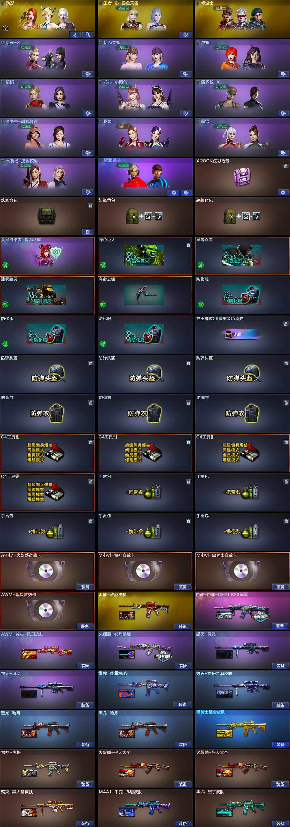 【皮肤】:白虎-白鲨-CFPLS23冠军,AWM-裁决-凤灵皮肤,雷神-能量核心,雷神-虎将,雷神-烈虎皮肤,火麒麟-平天大圣*2,火麒麟-巅峰荣耀,毁灭-黑大圣皮肤,毁灭-风暴*2,毁灭-神秘黑洞皮肤,M4A1-千变-孔明皮肤,黑龙-暗月*2,黑龙-墨子皮肤,黑骑士耀金皮肤,AK47-B-常胜将军-曹操,AK47-B-常胜将军-刘备