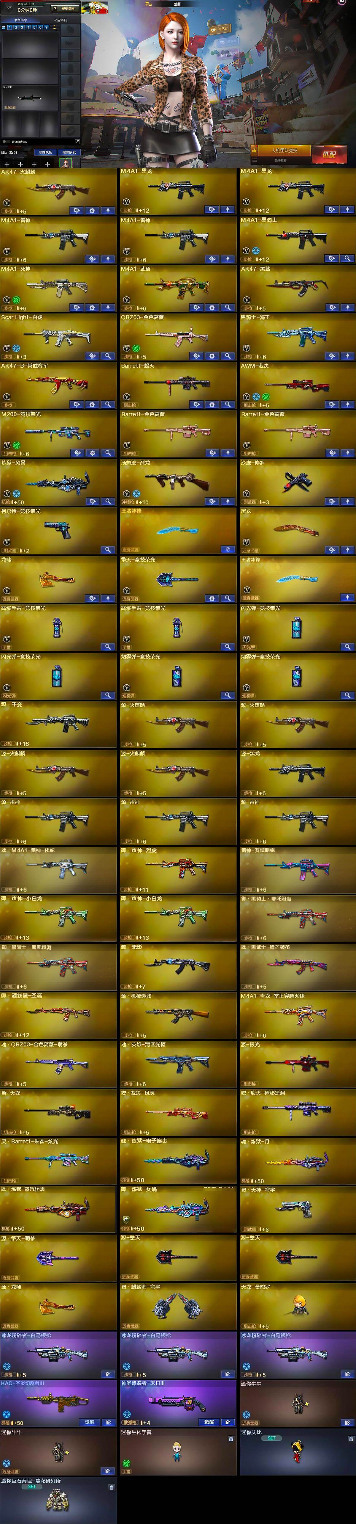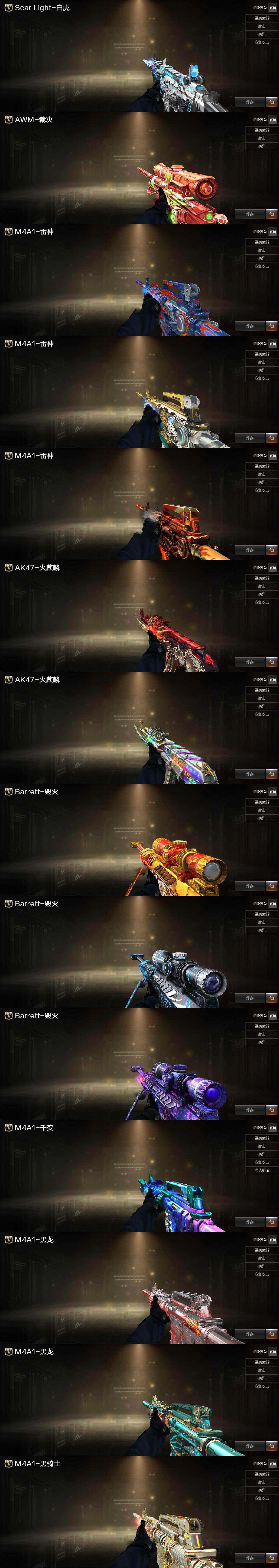 【英雄级武器】:AK47-火麒麟,M4A1-黑龙*2,M4A1-雷神*2,M4A1-黑骑士,M4A1-死神,M4A1-武圣,AK47-黑鲨,Scar Light-白虎,QBZ03-金色蔷薇,黑骑士-海王,AK47-B-常胜将军,Barrett-毁灭,AWM-裁决,M200-竞技荣光,Barrett-金色蔷薇*2,炼狱-风暴,汤姆逊-烈龙,沙鹰-修罗,柯尔特-竞技荣光,屠龙,龙啸,擎天-竞技荣光,王者冰锋-觉醒版,高爆手雷-竞技荣光*2,闪光弹-竞技荣光*2,烟雾弹-竞技荣光*2
