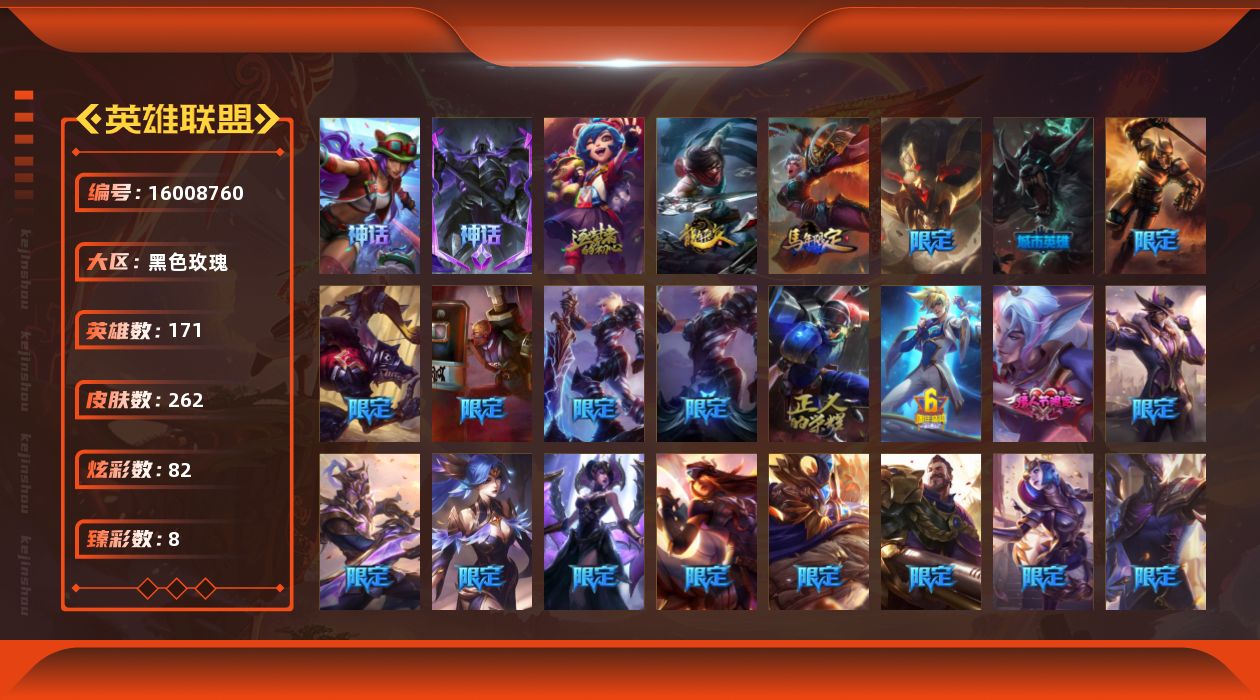 铂金段位-171英雄-262皮肤-82炫彩-0终极-3神话-45限定-31传说-66史诗
