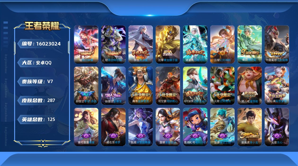 [16023024]【店主推荐捡漏号!可直接换绑】安卓Q-V7-最强王者段位-125英雄-287皮肤-2典藏-7传说-79史诗