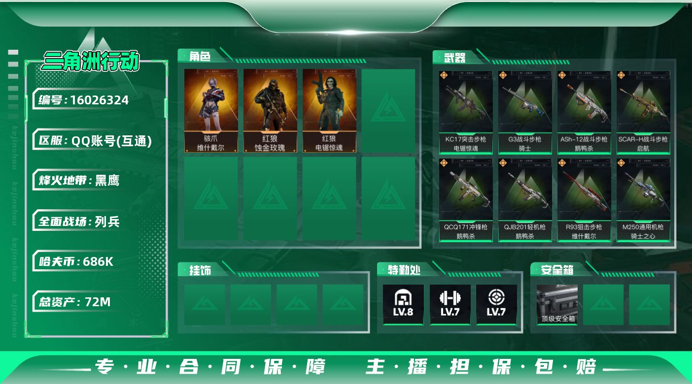 [16026324]【特价出售/店主推荐】 72m总资产-686k哈伏币-60烽火等级-黑鹰-11战场等级-列兵 【干员外观】:红狼-蚀金玫瑰,骇爪-维什戴尔,红狼-电锯惊魂 【近战皮肤】:近战-黑鹰 【传说外观】:M4A1突击步枪-蚀金玫瑰,M4A1突击步枪-阿米娅,ASh-12战斗步枪-鹅鸭杀,SCAR-H战斗步枪-启航,G3战斗步枪-骑士,CAR-15突击步枪-阿米娅,KC17突击步枪-电锯惊魂,勇士冲锋枪-能天使-午夜邮差,QCQ171冲锋枪-鹅鸭杀,M250通用机枪-骑士之心,QJB201轻机枪-鹅鸭杀,R93狙击步枪-维什戴尔 【史诗外观】:ASh-12战斗步枪-无极限,腾龙突击步枪-猎鳄行动,K437突击步枪-守护者,MP5冲锋枪-深海恐惧,MP5冲锋枪-战术竞备,MP5冲锋枪-竞技风,P90冲锋枪-莫斯提马,Vector冲锋枪-猎鳄行动,SR-3M紧凑突击步枪-战术竞备,勇士冲锋枪-工业狂潮,MP7冲锋枪-守护者,M250通用机枪-囚徒,Mini-14射手步枪-守护者,M700狙击步枪-蝮蛇,AWM狙击步枪-无极限,沙漠之鹰-曙光,复合弓-守护者 【稀有外观】:SG552突击步枪-巨兽,AKM突击步枪-战术演练,AKM突击步枪-肃杀,QBZ95-1突击步枪-公平竞技,M7战斗步枪-捣蛋鬼,SCAR-H战斗步枪-荣耀列队,SCAR-H战斗步枪-黄昏,G3战斗步枪-战术演练,G3战斗步枪-主宰,腾龙突击步枪-冰天雪地,MP5冲锋枪-弄臣,MP5冲锋枪-哈夫克卫队,P90冲锋枪-黄昏,Vector冲锋枪-先锋,UZI冲锋枪-亚特兰蒂斯,SMG-45-行动开启,SMG-45冲锋枪-幻影结构,M1014霰弹枪-幻影结构,S12K霰弹枪-战术演练,QJB201轻机枪-黄昏,QJB201轻机枪-哈夫克卫队,Mini-14射手步枪-荣耀列队,SKS射手步枪-弄臣,SV-98狙击步枪-星链科技,SV-98狙击步枪-哈夫克航天,SV-98狙击步枪-精英联盟 【普通外观】:.357左轮-淘金者,G17-古铜,M4A1突击步枪-粉色涂装,M4A1突击步枪-高雅黑,M4A1突击步枪-海色,QBZ95-1突击步枪-高雅黑,QBZ95-1突击步枪-海浪,QBZ95-1突击步枪-三角洲力量,QBZ95-1突击步枪-海色,K416突击步枪-几何迷彩,K416突击步枪-高雅黑,M16A4突击步枪-高雅黑