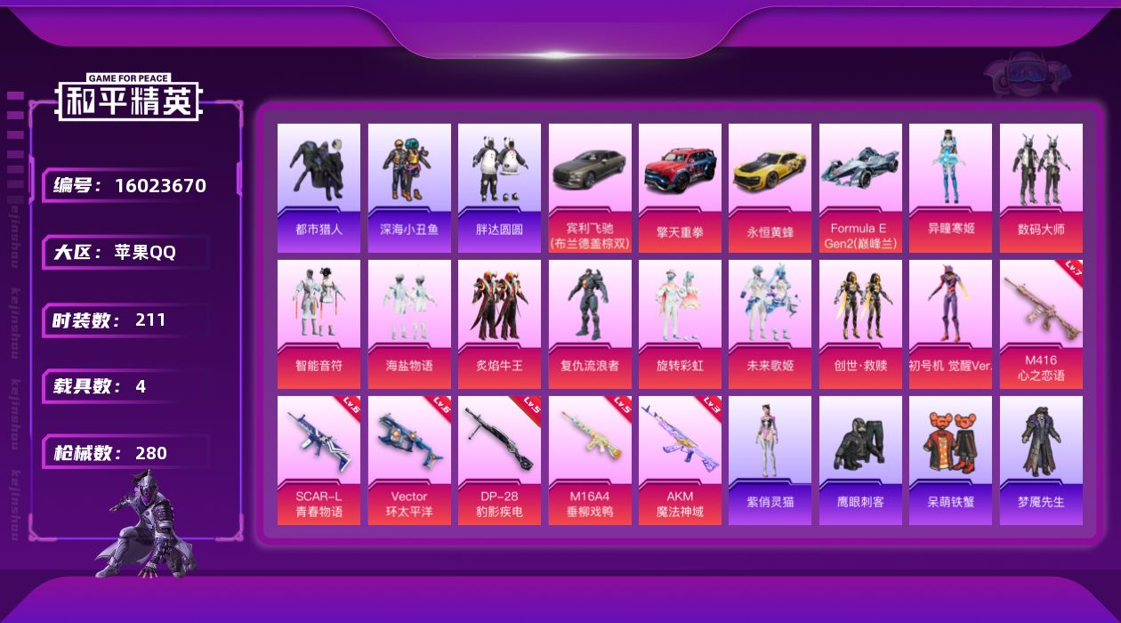 [16023670]【店主推荐捡漏号!可直接换绑】苹果 手Q-10粉装-6特效枪-4载具-4粉色飞行器-94797热力值-17王牌印记-211套装-280枪皮【热门品类】:套装-浪漫天命,套装-都市猎人,套装-深海小丑鱼,套装-胖达圆圆,套装-金羽特工,套装-SS1特训,套装-龟仙人,套装-暗影哥特,套装-粉红小猪,角色-Mark.06【粉色载具】:宾利飞驰(布罗德盖棕双色),擎天重拳,永恒黄蜂,Formula E Gen2(巅峰兰)【粉色套装】:粉装-数码大师,粉装-智能音符,粉装-海盐物语,粉装-炙焰牛王,角色-复仇流浪者,粉装-旋转彩虹,粉装-未来歌姬,套装-创世·救赎,角色-初号机 觉醒Ver.,角色-异瞳寒姬【粉色枪皮等级】:AKM-魔法神域(三级),M16A4-垂柳戏鸭(五级),SCAR-L-青春物语(六级),M416-心之恋语(七级),Vector-环太平洋(六级),DP-28-豹影疾电(五级)【粉色枪皮】:AKM-魔法神域,M16A4-垂柳戏鸭,SCAR-L-青春物语,M416-心之恋语,Vector-环太平洋,DP-28-豹影疾电【粉色飞行器】:神秘黑猫飞行器,天之羽翼飞行器,深渊漩涡飞行器