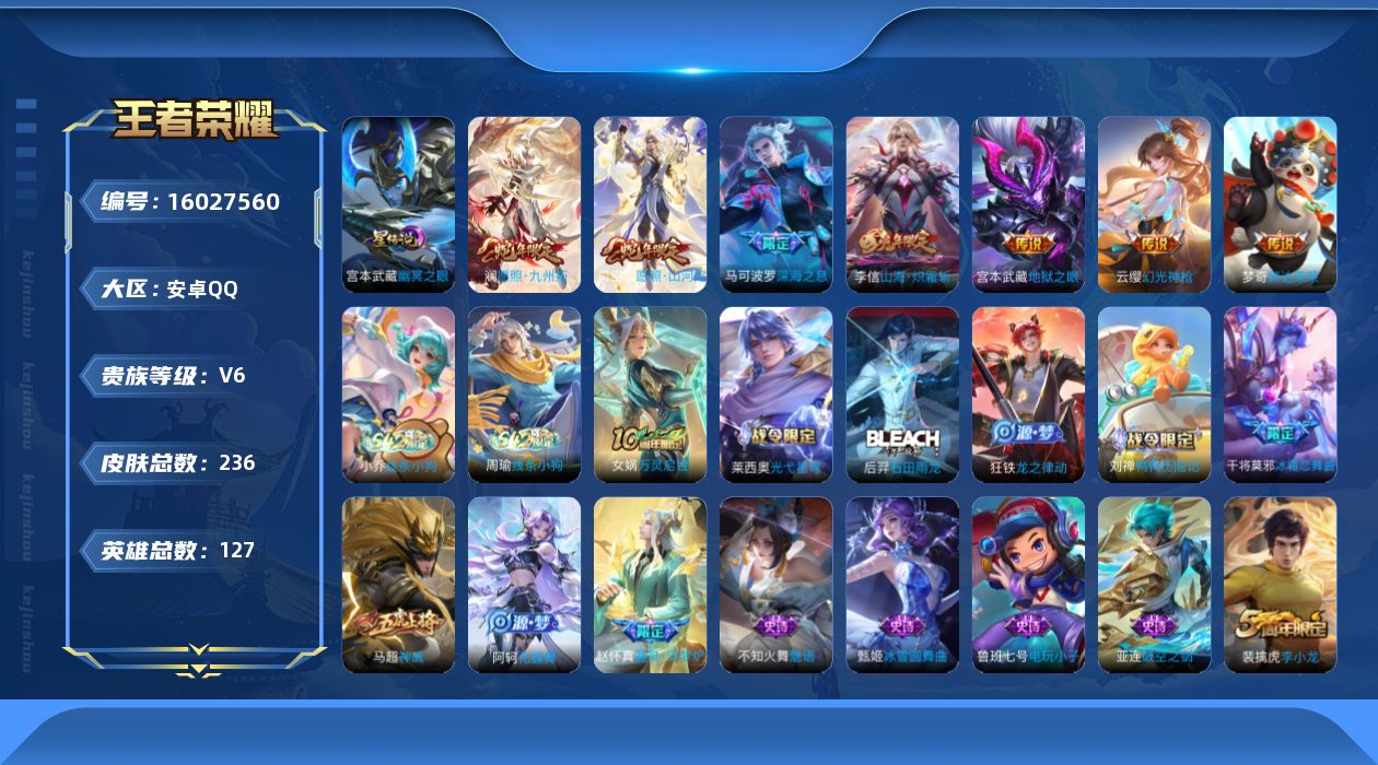 [16027560]【店主推荐捡漏号!可直接换绑】安卓Q-V6-至尊星耀III段位-127英雄-236皮肤-7传说-56史诗-1星元 【英雄全皮】:影全皮 【传说皮肤】:司空震愿照山河定,澜愿照九州拓,云缨幻光神枪,李信山海炽霜斩,马可波罗深海之息,梦奇胖达荣荣,宫本武藏地狱之眼 【限定皮肤】:姜子牙天穹之誓,杨戬破阵退雄兵,狄仁杰阴阳师,赵云皇家上将,嬴政优雅恋人,庄周高山流水,高渐离玩趣恶龙,元歌无心,夏侯惇朔风刀,马可波罗深海之息,狄仁杰魔术师,狄仁杰万华元夜,达摩星际陆战队,达摩沙漠行僧,项羽海滩派对,老夫子醍醐杖,程咬金演武夺筹,兰陵王金庭之子,牛魔御旌,后羿如梦令,李元芳云中旅人,钟馗驱傩正仪,干将莫邪冰霜恋舞曲,太乙真人华丽摇滚,鬼谷子原初探秘者,鬼谷子五谷丰年,苏烈千军破阵,弈星混沌棋,梦奇顽趣,沈梦溪大漠名商,明世隐疑决卦,裴擒虎李小龙,裴擒虎擒涛扼浪,米莱狄御霄,云中君纤云弄巧,李信山海炽霜斩,蒙犽狂想玩偶喵,鲁班大师探海日志,桑启海盐诗旅,艾琳女武神,阿古朵江河有灵,张良古海寻踪,蒙恬荣光圣徽,鬼谷子天穹祈灯,沈梦溪龙舞盛年,刘邦剑破天穹,程咬金群星魔术团,周瑜熔金海岸 【年限皮肤】:李信山海炽霜斩,司空震愿照山河定,澜愿照九州拓 【赛季限定】:米莱狄御霄,牛魔御旌,夏侯惇朔风刀,弈星混沌棋,明世隐疑决卦,老夫子醍醐杖,鬼谷子原初探秘者,狄仁杰万华元夜,程咬金演武夺筹,钟馗驱傩正仪,苏烈千军破阵,达摩沙漠行僧,兰陵王金庭之子,沈梦溪大漠名商,李元芳云中旅人,桑启海盐诗旅,裴擒虎擒涛扼浪,鲁班大师探海日志,张良古海寻踪,鬼谷子天穹祈灯,刘邦剑破天穹,姜子牙天穹之誓,东皇太一噬灭天穹,太乙真人谧流熔炉,钟馗虚灵犬护,甄姬逆浪荇歌,亚瑟荣光之誓,梦奇顽趣,蒙恬荣光圣徽 【战令限定】:蒙犽狂想玩偶喵,达摩星际陆战队,亚连破空之剑,孙悟空神迹守卫,孙膑茶境仙,马超访茗客,刘禅鸭鸭历险记,沈梦溪鸭鸭历险记,莱西奥光弋星穹,明世隐往忆晖光,周瑜线条小狗,小乔线条小狗 【史诗皮肤】:鲁班七号电玩小子,赵云皇家上将,赵云未来纪元,甄姬冰雪圆舞曲,王昭君偶像歌手,狄仁杰魔术师,宫本武藏鬼剑武藏,孙尚香水果甜心,嬴政优雅恋人,嬴政摇滚巨星,妲己魅力维加斯,墨子金属风暴,吕布圣诞狂欢,刘禅绅士熊喵,曹操幽灵船长,李白千年之狐,张飞乱世虎臣,花木兰水晶猎龙者,刘邦德古拉伯爵,兰陵王暗隐猎
