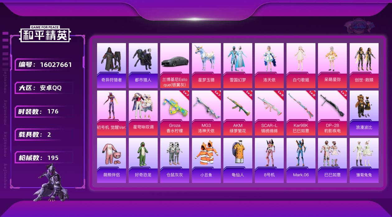 [16027661]【特价出售/店主推荐】安卓 手Q-7粉装-6特效枪-2载具-1粉色飞行器-64256热力值-11王牌印记-176套装-195枪皮 【热门品类】:粉装-雪国幻梦,套装-都市猎人,套装-小丑鱼,套装-奇异狩猎者,套装-SS1特训,套装-龟仙人,套装-浪漫波比,套装-萌熊伴侣,角色-8号机,角色-Mark.06 【粉色套装】:粉装-雪国幻梦,角色-洛天依,角色-白勺歌姬,角色-呆萌星弥,套装-创世·救赎,角色-初号机 觉醒Ver.,粉装-星穹咏叹调 【粉色枪皮等级】:AKM-绿萝繁花(五级),SCAR-L-锦绣绵绵(五级),GROZA-香水柠檬(七级),Kar98K-巳巳如意(五级),DP-28-豹影疾电(三级),MG3-洛神天依(七级) 【粉色载具】:兰博基尼Estoque(银翼灰),星梦玉骢 【粉色枪皮】:AKM-绿萝繁花,SCAR-L-锦绣绵绵,GROZA-香水柠檬,Kar98K-巳巳如意,DP-28-豹影疾电,MG3-洛神天依 【粉色飞行器】:超新星飞行器 【粉色降落伞】:百万伏特降落伞,凝视深渊降落伞,至尊龙雀降落伞,神秘黑猫降落伞,香水柠檬降落伞,洛神天依降落伞,海渊国主降落伞,焦糖拿铁降落伞,海螺星光降落伞,闲梦青缨降落伞,超新星降落伞,圣堂之誓降落伞,小叽联名款降落伞,猪猪侠降落伞,星梦奇缘降落伞,初号机 觉醒Ver.降落伞,忍者神龟降落伞,临安公主降落伞 【稀有套装】:套装-龟仙人,套装-巳巳如意,套装-雏菊兔兔,套装-萝兰蝴蝶,套装-小熊娃娃,角色-灵公主 【稀有枪皮】:AKM-冰凉西瓜,AKM-夜灯,AKM-奇异狩猎者,AKM-彩虹符号,AKM-星之信仰,AKM-百万伏特,AKM-破晓战魂,AKM-霓虹街区,M16A4-红色方程式,M16A4-蓝色火焰,SCAR-L-夜灯,SCAR-L-是爱神辣,SCAR-L-炫彩节奏,SCAR-L-红色方程式,M416-仓鼠灰灰,M416-糯团青竹,M416-红色方程式,M416-蓝色火焰,GROZA-影袭,GROZA-生命誓言,GROZA-田园牧歌,GROZA-黑色刀锋,AUG-耀粉歌者,AUG-青春冒险家,QBZ-洛神天依,QBZ-飞驰魅影,M762-奇异狩猎者,M762-拳皇97,M762-镭射皇者,Mk47-洛神天依,Mk47-百万伏特,AC-VAL-天降萌叽,AC-VAL-快闪甜心,蜜獾-天降萌叽,UZ