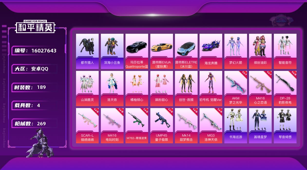 [16027643]【特价出售/店主推荐】安卓 手Q-9粉装-9特效枪-4载具-1僚机-3粉色飞行器-89008热力值-17王牌印记-189套装-269枪皮 【热门品类】:粉装-梦幻火箭,粉装-缤纷油彩,套装-浪漫天命,套装-都市猎人,套装-深海小丑鱼,套装-小丑鱼,套装-龟仙人,套装-暗影哥特,角色-8号机,角色-Mark.06 【粉色套装】:粉装-梦幻火箭,粉装-智能音符,粉装-缤纷油彩,粉装-山涧鹿灵,角色-洛天依,粉装-橘柚倾心,粉装-飒粉甜心,套装-创世·救赎,角色-初号机 觉醒Ver. 【粉色枪皮等级】:AKM-梦之光华(七级),SCAR-L-锦绣绵绵(五级),M416-心之恋语(七级),M416-电玩时刻(五级),M762-青锋波束(五级),UMP45-量子极限(五级),Mk14-甜梦熊击(五级),DP-28-豹影疾电(五级),MG3-洛神天依(四级) 【粉色载具】:路特斯EVIJA(星际黄),路特斯ELETRE(冰川蓝),玛莎拉蒂Quattroporte(夜幕蓝),海龙奔腾,僚机-萌兔起飞 【粉色枪皮】:AKM-梦之光华,SCAR-L-锦绣绵绵,M416-心之恋语,M416-电玩时刻,M762-青锋波束,UMP45-量子极限,Mk14-甜梦熊击,DP-28-豹影疾电,MG3-洛神天依 【粉色飞行器】:梦幻火箭飞行器,天之羽翼飞行器,歌者泠鸢飞行器 【粉色降落伞】:绝对恒星降落伞,百万伏特降落伞,梦幻火箭降落伞,林间仙鹿降落伞,洛神天依降落伞,蓝莓炮弹降落伞,垂柳戏鸭降落伞,歌者泠鸢降落伞,暗夜鎏金降落伞,音爆索尼克降落伞,仲夏莫吉托降落伞,飒粉甜心降落伞,未来歌姬降落伞,莲影清波降落伞,蜜语绒猫降落伞,罪夜之冕降落伞 【稀有套装】:套装-龟仙人,套装-雪国风尚,套装-雏菊兔兔,套装-萝兰蝴蝶,套装-云朵鹅,套装-雪绒豹,角色-灵公主,角色-乐音,套装-朱霞炽焰,套装-凌霄紫焰,角色-申公豹,套装-书海巡游,套装-画境星梦,套装-琴音绮想 【稀有枪皮】:AKM-奇异狩猎者,AKM-彩虹符号,AKM-影袭,AKM-生命誓言,AKM-百万伏特,AKM-破晓战魂,AKM-缤纷海域,AKM-萌趣颜团子,AKM-虎虎生威,AKM-霓虹街区,AKM-龙的传人,M16A4-幻世战舞者,M16A4-甜心亚梦,M16A4-红色方程式,M16A4-蓝色火焰,SCAR-L-炫彩节奏,SCAR