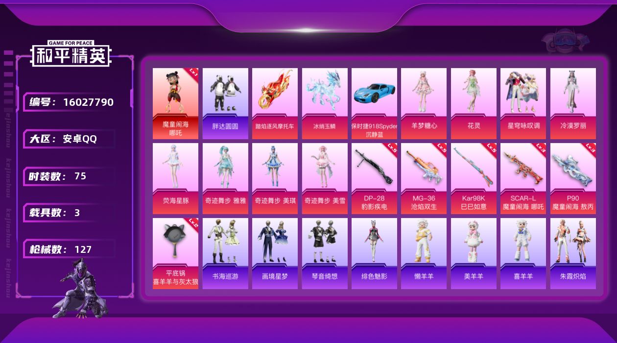 [16027790]【特价出售/店主推荐】1625点卷 安卓 手Q-1神装-8粉装-6特效枪-3载具-1僚机-4粉色飞行器-43129热力值-4王牌印记-75套装-127枪皮 【红色神装等级】:魔童闹海-哪吒(一级) 【红色角色神装】:魔童闹海-哪吒 【热门品类】:套装-胖达圆圆 【粉色套装】:粉装-星穹咏叹调,角色-冷漠罗丽,角色-荧海星豚,角色-奇迹舞步 雅雅,角色-奇迹舞步 美琪,角色-奇迹舞步 美雪,角色-花灵,角色-羊梦糖心 【粉色枪皮等级】:SCAR-L-魔童闹海 哪吒(三级),P90-魔童闹海 敖丙(三级),Kar98K-巳巳如意(五级),DP-28-豹影疾电(五级),MG-36-沧焰双生(五级),平底锅-喜羊羊与灰太狼(二级) 【粉色载具】:保时捷918 Spyder(沉静蓝),踏焰逐风摩托车,僚机-冰龙团团,冰绡玉鳞 【粉色枪皮】:SCAR-L-魔童闹海 哪吒,P90-魔童闹海 敖丙,Kar98K-巳巳如意,DP-28-豹影疾电,MG-36-沧焰双生,平底锅-喜羊羊与灰太狼 【粉色飞行器】:鎏金朋克飞行器,飞天猪飞行器,灵珠游龙飞行器 【粉色降落伞】:鎏金朋克降落伞,精灵梦叶罗丽降落伞,千金淑猫降落伞,晶梦幻蝶降落伞,智耀战神降落伞,绯果甜心降落伞,星穹咏叹调降落伞,幻彩电音降落伞,时光之吻降落伞,冷漠罗丽降落伞,奇迹舞步降落伞,喜羊羊与灰太狼降落伞,魔童闹海 哪吒降落伞,魔童闹海 敖丙降落伞,异瞳寒姬降落伞,极意拳锋降落伞,炫彩糖果降落伞 【稀有套装】:套装-摩登天骄,套装-巳巳如意,套装-小鸟芋圆,套装-乐游熊熊,套装-暖暖向日葵,套装-雪国风尚,套装-炫彩糖果,角色-摩登魅猫,套装-燕燕于飞,套装-鱼渊荷华,套装-晶辉守护,套装-白辉玉蕊,套装-粉恋花,套装-紫幽梦,套装-蓝冰羽,角色-瑰梦爱神,套装-星影赞美诗,套装-星渊小夜曲,套装-极速光影,套装-彩虹兔,套装-云朵鹅,套装-雪绒豹,角色-乐音,套装-朱霞炽焰,套装-凌霄紫焰,套装-擎苍青焰,玩偶服-懒羊羊,玩偶服-美羊羊,玩偶服-喜羊羊,角色-绯色魅影,套装-书海巡游,套装-画境星梦,套装-琴音绮想 【稀有枪皮】:AUG-冰晶雪宝,AKM-破晓战魂,M16A4-幻世战舞者,SCAR-L-夜灯,M416-红色方程式,M762-第五大道,M762-云朵鹅,Mk47-炫光之旅,G36C-星穹咏叹调,AC-VA