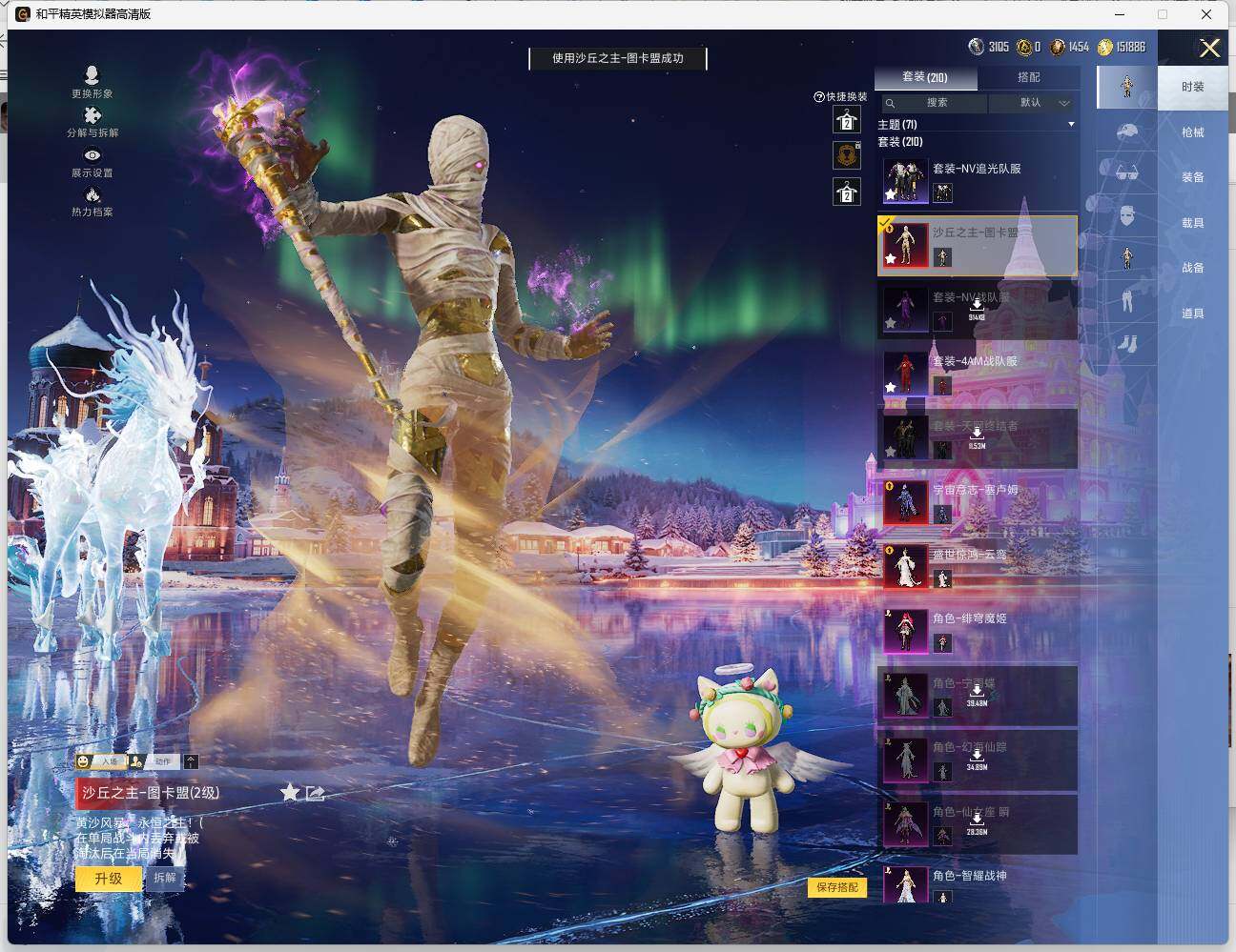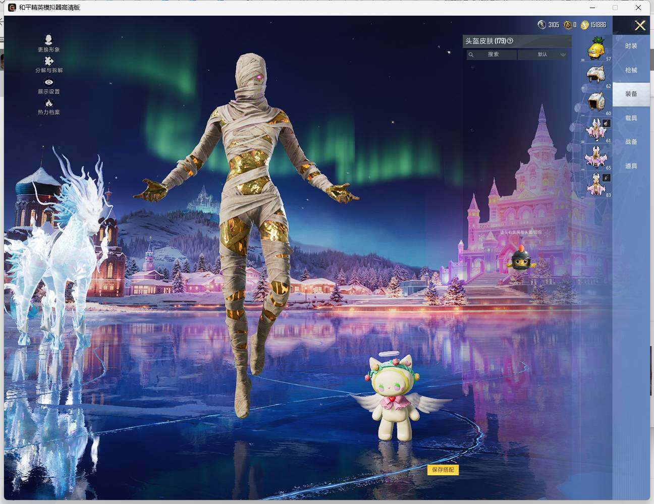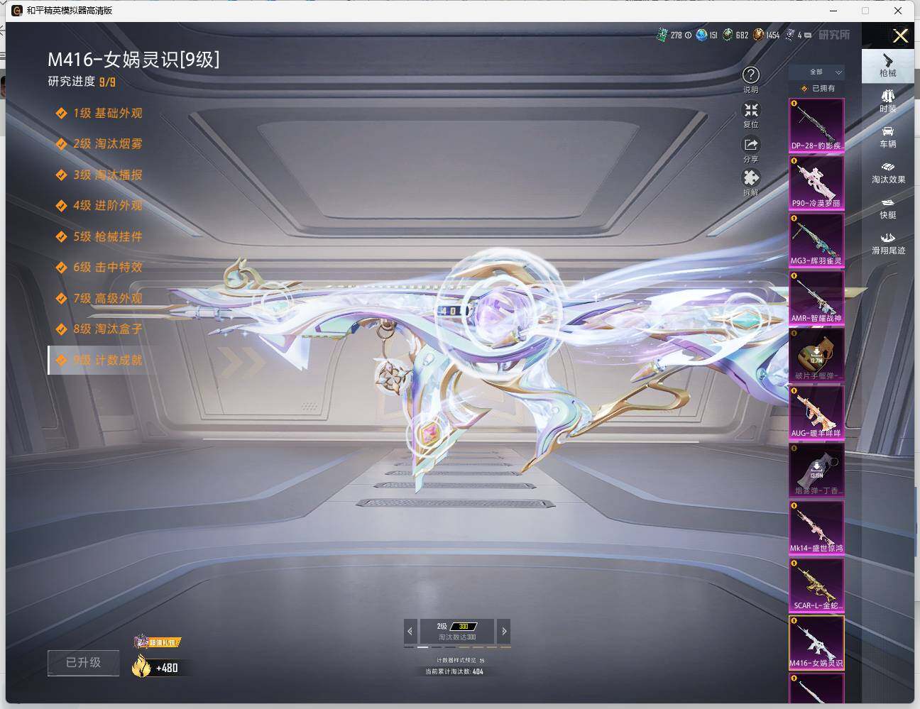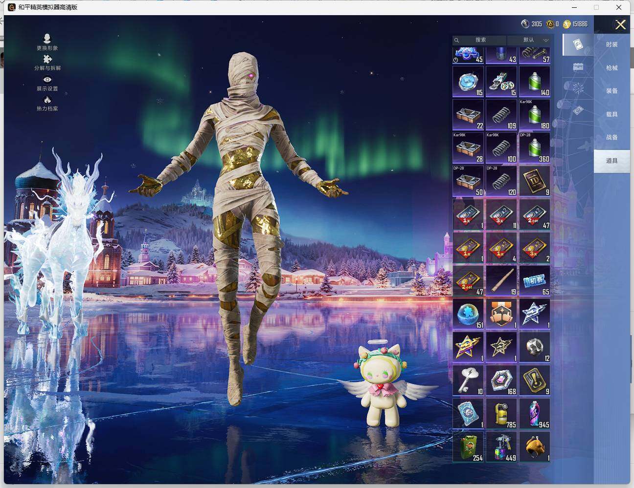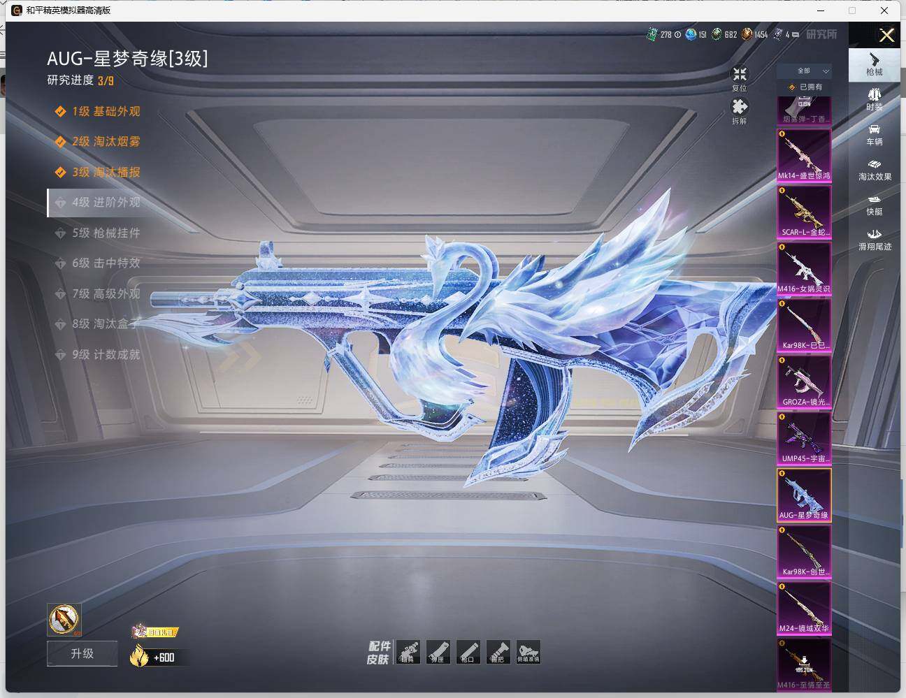 SCAR-L-金蛇镇世,M416-至情至圣,M416-女娲灵识,GROZA-镜光银凌,AUG-星梦奇缘,AUG-暖羊咩咩,UMP45-宇宙意志,Kar98K-创世·救赎,Kar98K-巳巳如意,M24-镜域双华,Mk14-盛世惊鸿,烟雾弹-丁香清露,破片手榴弹-热量炸弹