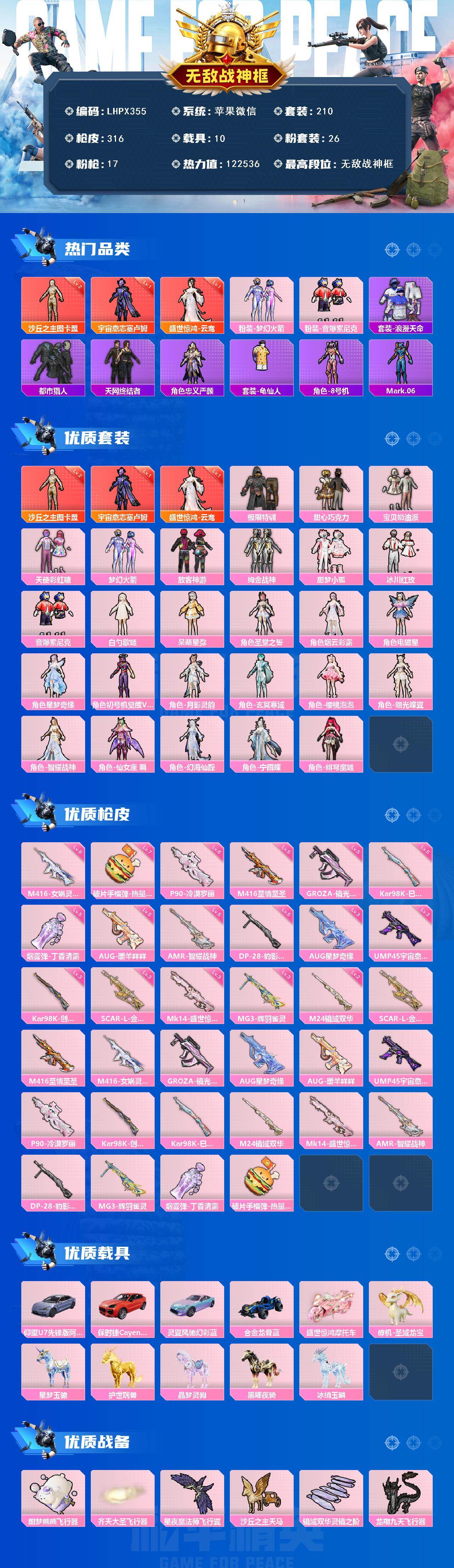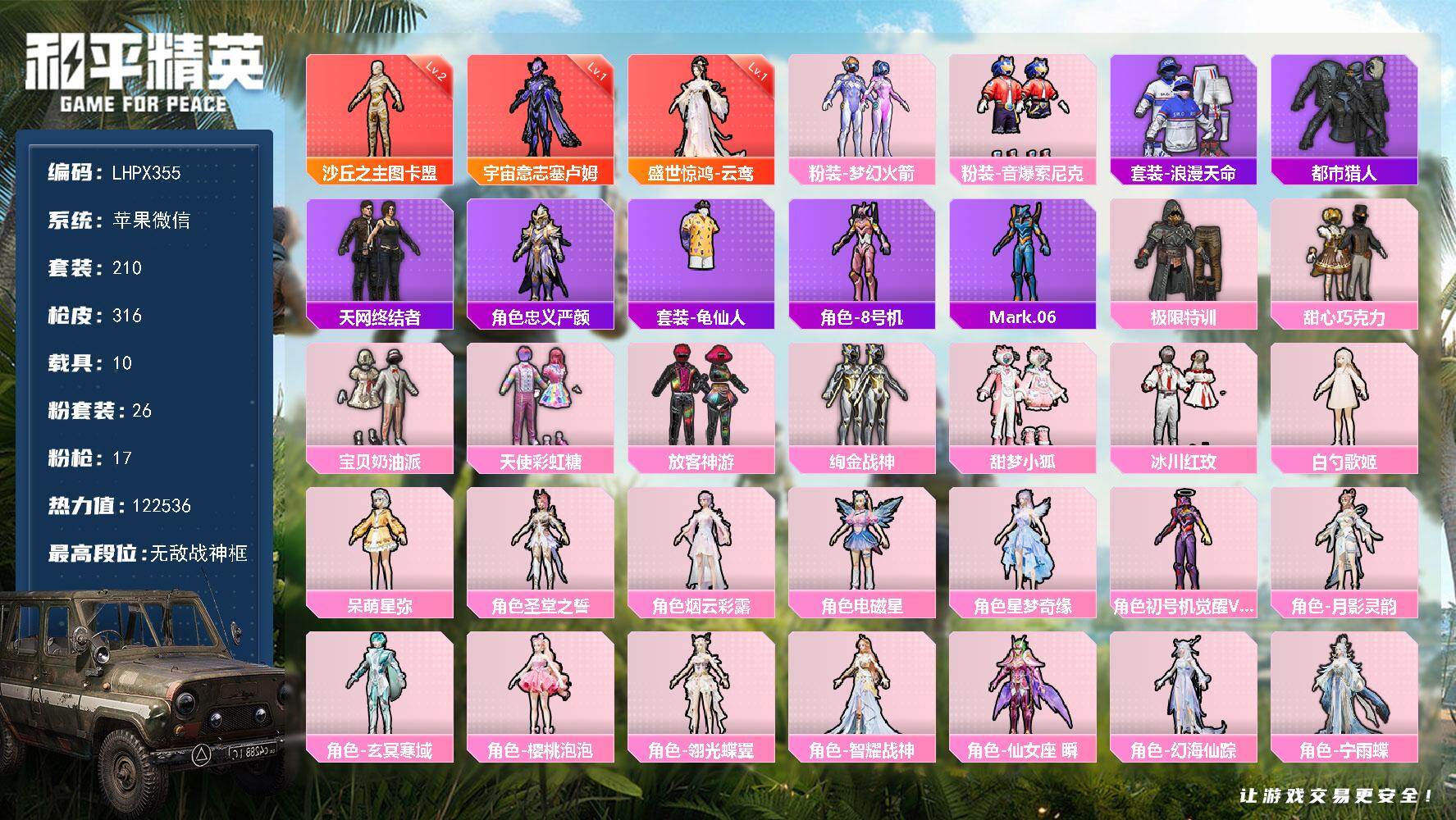 [16027865]【特价出售/店主推荐】苹果 微信-无敌战神框-3神装-26粉装-17特效枪-10载具-19粉色飞行器-122536热力值-16王牌印记-210套装-316枪皮