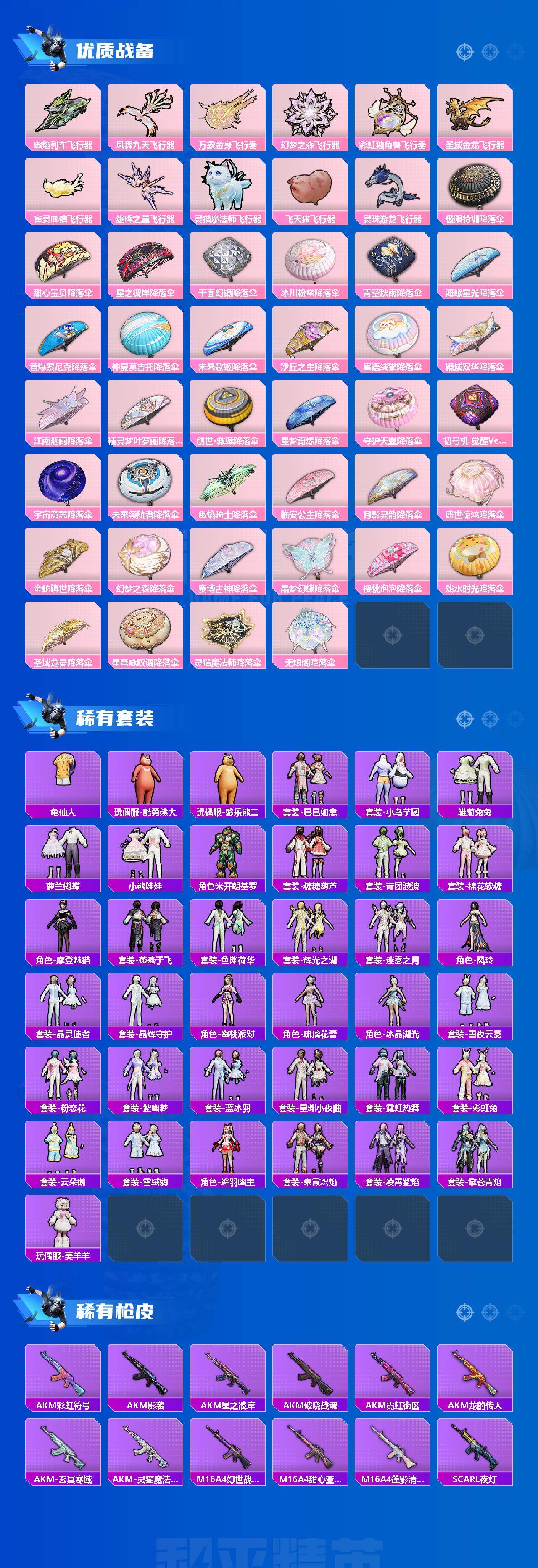 - PX_2064534- 安卓手Q-11王牌印记-6粉装-4特效枪-1载具-56590热力值-159套装-178枪皮-1卓越印记-0传奇印记 【6粉装】,幻彩电音,复仇流浪者,炫光之旅,寒光使者,创世·救赎,美琪 【4特效枪】M416-电玩时刻-5级 GROZA-镜光银凌-5级 AUG-暖羊咩咩-5级 Kar98K-巳巳如意-5级 【4稀有紫装】,Mark.06,奇异狩猎者,胖达圆圆,龟仙人, 【