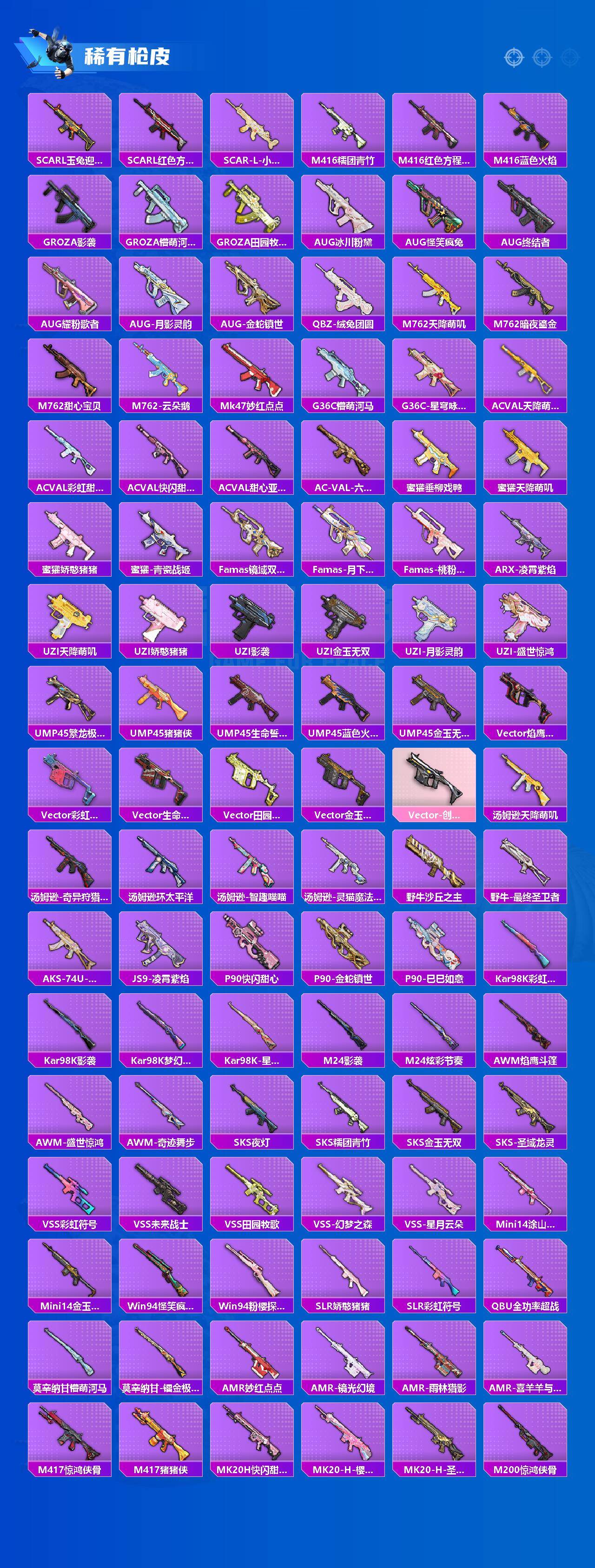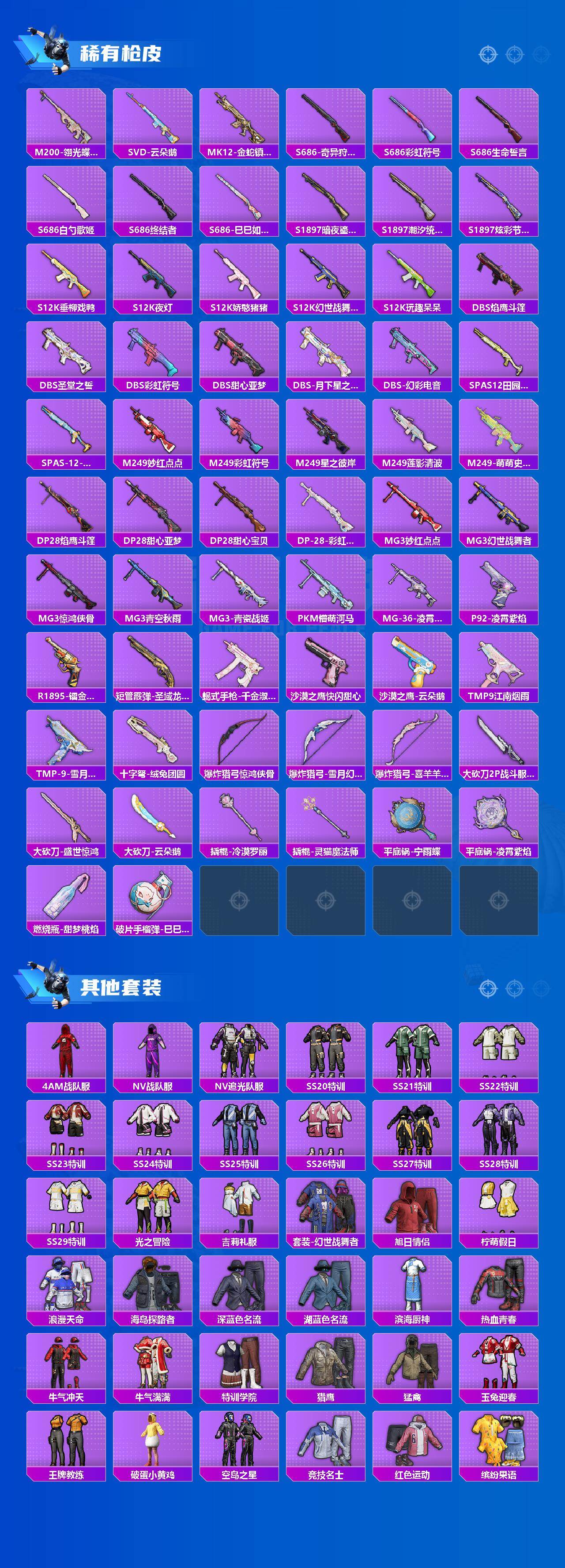 【粉色枪皮】:SCAR-L-金蛇镇世,M416-至情至圣,M416-女娲灵识,GROZA-镜光银凌,AUG-星梦奇缘,AUG-暖羊咩咩,UMP45-宇宙意志,P90-冷漠罗丽,Kar98K-创世·救赎,Kar98K-巳巳如意,M24-镜域双华,Mk14-盛世惊鸿,AMR-智耀战神,DP-28-豹影疾电,MG3-辉羽雀灵,烟雾弹-丁香清露,破片手榴弹-热量炸弹