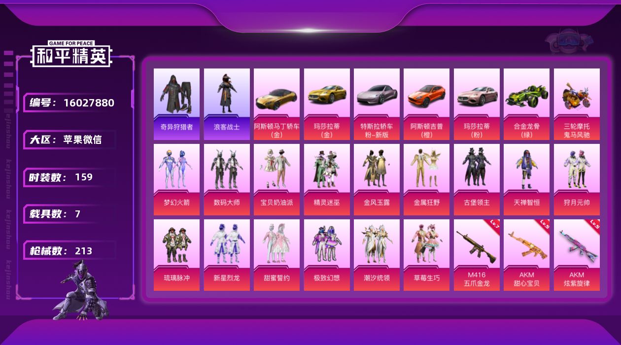 [16027880]【特价出售/店主推荐】苹果,微信-15粉装-10特效枪-7载具-4粉色飞行器-91361热力值-4王牌印记-159套装-213枪皮