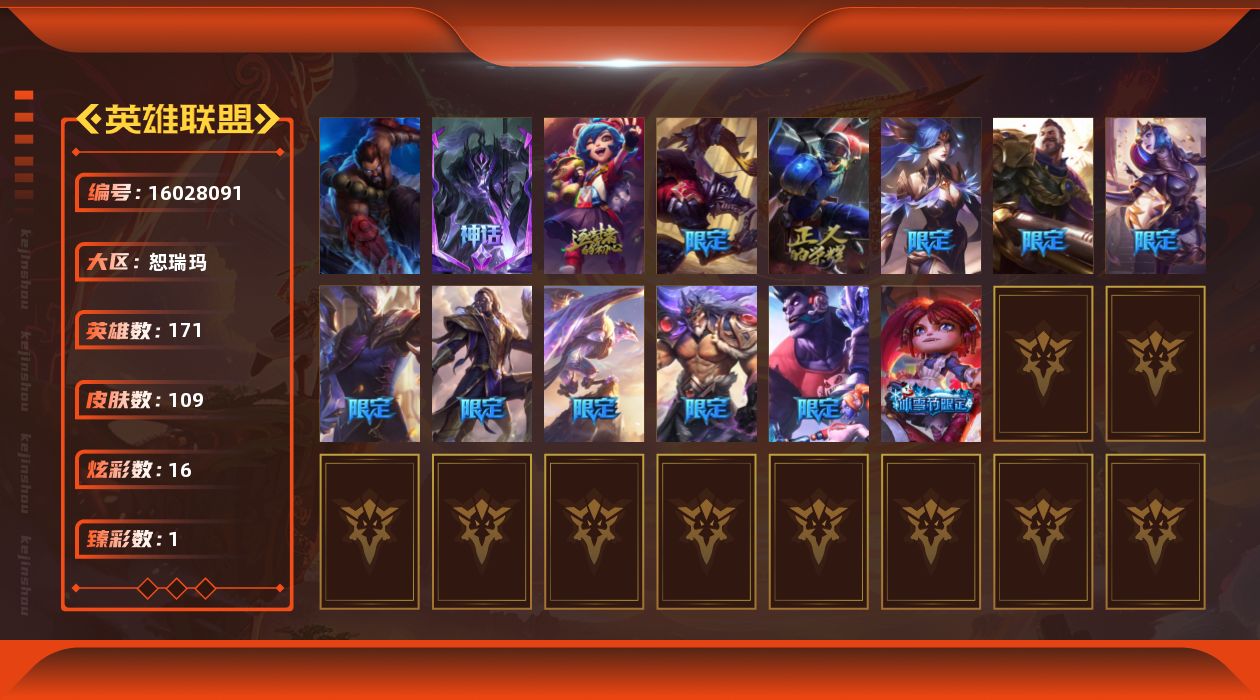 [16028091]【特价出售/店主推荐】黄金段位-171英雄-109皮肤-16炫彩-1终极-2神话-14限定-11传说-37史诗