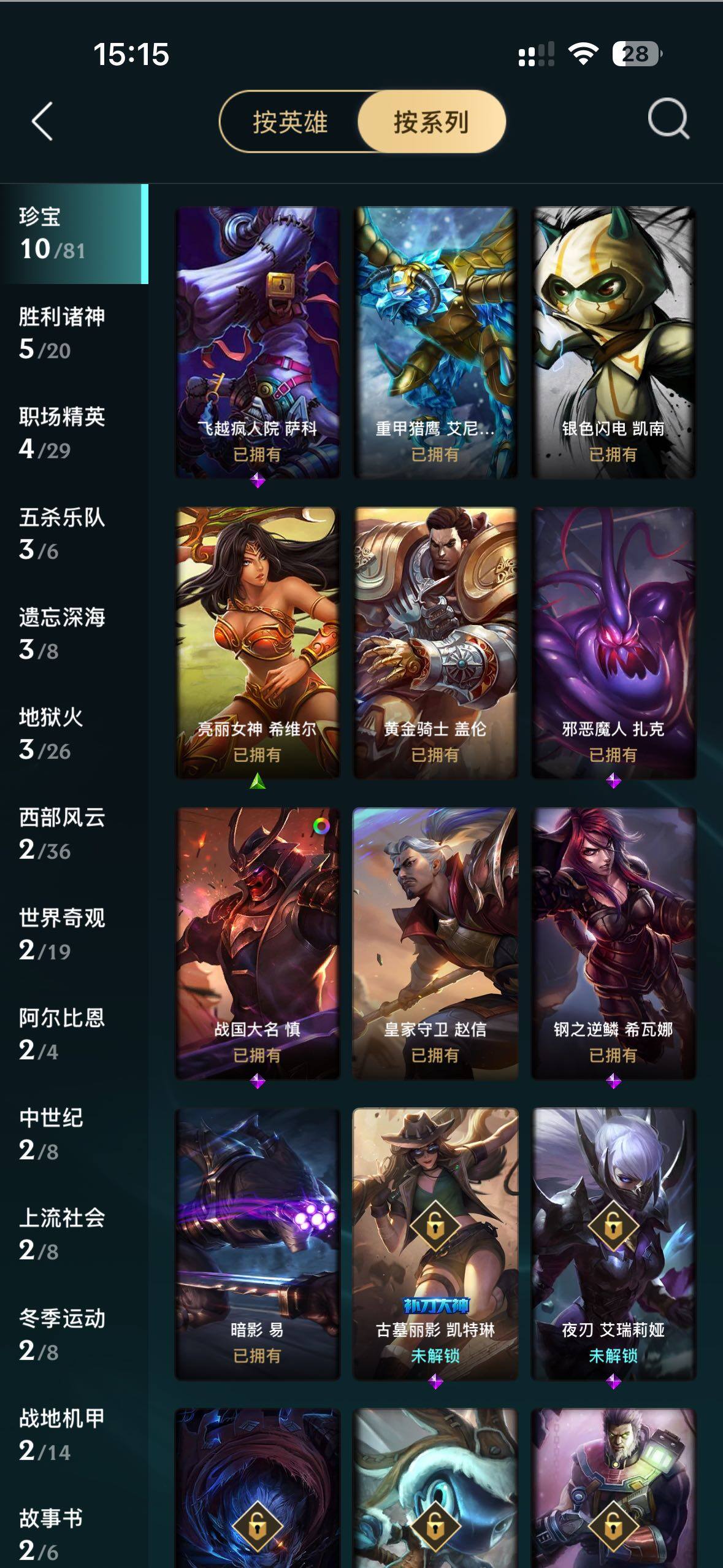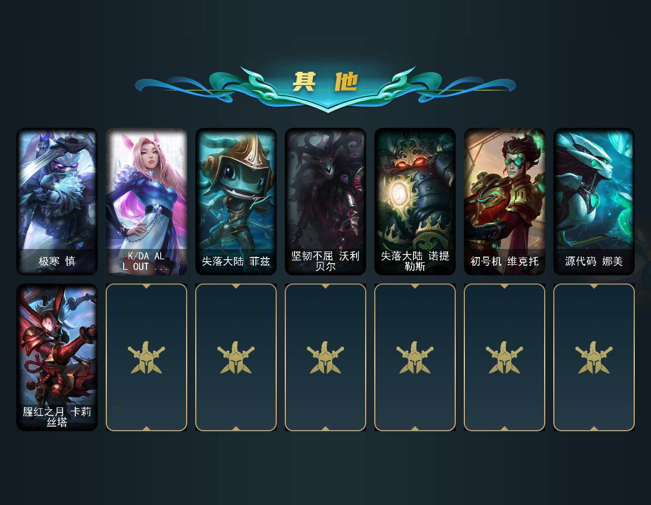【其他皮肤1】:小红帽安妮,皇家守卫赵信,秘密特工赵信,学生会长弗拉基米尔,暗影易,部落精神瑞兹,蕉泥座人索拉卡,西部牛仔厄运小姐,特工狂花厄运小姐,黑夜使者泰达米尔,宗师级钓鱼训练师贾克斯,北风冻原图奇,五杀摇滚主唱卡尔萨斯,重甲猎鹰艾尼维亚,深海一号卡萨丁,虚空前世卡萨丁,紫水晶意志塔里克,冰壶选手维迦,里尔击球手特朗德尔,荒野治安官凯特琳,恶咒亡魂魔腾,烈焰古树茂凯,星河战队雷克顿,荒野之咬雷克顿,哥特女仆奥莉安娜,传统僧侣李青,武力全开乌迪尔,冒险精神伊泽瑞尔,足球先生伊泽瑞尔,五杀摇滚吉他手莫德凯撒,五杀摇滚贝斯手约里克,银色闪电凯南,黄金骑士盖伦,魔灵玛尔扎哈,毛毛虫克格莫,极寒慎,KDAALLOUT阿狸,失落大陆菲兹,坚韧不屈沃利贝尔,失落大陆诺提勒斯,初号机维克托,源代码娜美,腥红之月卡莉丝塔