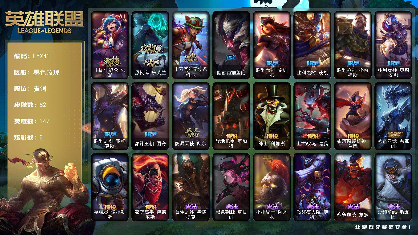 [16028126]【特价出售/店主推荐】青铜段位-147英雄-82皮肤-3炫彩-0终极-3神话-8限定-7传说-18史诗 【臻彩皮肤】:星之守护者卡莎热情之光 【神话皮肤】:十周年纪念安妮,源代码乐芙兰,十五周年纪念希维尔 【限定皮肤】:暗裔英雄盖伦,胜利女神希维尔,胜利之树茂凯,胜利枪神格雷福斯,胜利女神奥莉安娜,胜利之剑亚托克斯,都铎王朝图奇,防暴天使凯尔 【传说皮肤】:战地机甲厄加特,绅士科加斯,上古战魂魔腾,银河魔装机神兰博,冰霜亚龙希瓦娜,宇航员诺提勒斯,灌篮高手德莱厄斯 【史诗皮肤】:重生之沙费德提克,黑色荆棘莫甘娜,小小骑士阿木木,飞越疯人院萨科,战争血统蒙多,北领前线斯维因,抵抗军天使凯特琳,枯萎之壤雷克顿,防弹武僧李青,血色之锤波比,飞车暴走族古拉加斯,大夏武士潘森,刺客信条凯南,侏罗纪化石克格莫,战国大名慎,钢之逆鳞希瓦娜,野火之藤婕拉,邪恶魔人扎克 【王者皮肤】:死亡骑士内瑟斯 【勇士皮肤】:创意工坊黑默丁格,亮丽女神希维尔 【其他皮肤1】:小红帽安妮,皇家守卫赵信,秘密特工赵信,学生会长弗拉基米尔,暗影易,部落精神瑞兹,蕉泥座人索拉卡,西部牛仔厄运小姐,特工狂花厄运小姐,黑夜使者泰达米尔,宗师级钓鱼训练师贾克斯,北风冻原图奇,五杀摇滚主唱卡尔萨斯,重甲猎鹰艾尼维亚,深海一号卡萨丁,虚空前世卡萨丁,紫水晶意志塔里克,冰壶选手维迦,里尔击球手特朗德尔,荒野治安官凯特琳,恶咒亡魂魔腾,烈焰古树茂凯,星河战队雷克顿,荒野之咬雷克顿,哥特女仆奥莉安娜,传统僧侣李青,武力全开乌迪尔,冒险精神伊泽瑞尔,足球先生伊泽瑞尔,五杀摇滚吉他手莫德凯撒,五杀摇滚贝斯手约里克,银色闪电凯南,黄金骑士盖伦,魔灵玛尔扎哈,毛毛虫克格莫,极寒慎,KDAALLOUT阿狸,失落大陆菲兹,坚韧不屈沃利贝尔,失落大陆诺提勒斯,初号机维克托,源代码娜美,腥红之月卡莉丝塔