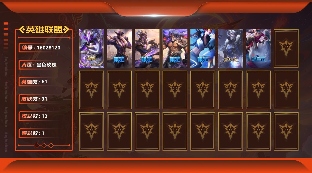 [16028120]【特价出售/店主推荐】白银段位-61英雄-31皮肤-12炫彩-0终极-1神话-7限定-1传说-3史诗
