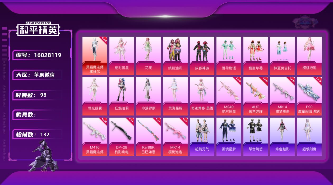 [16028119]【特价出售/店主推荐】苹果 微信-1神装-14粉装-8特效枪-0载具-4粉色飞行器-45809热力值-5王牌印记-98套装-132枪皮