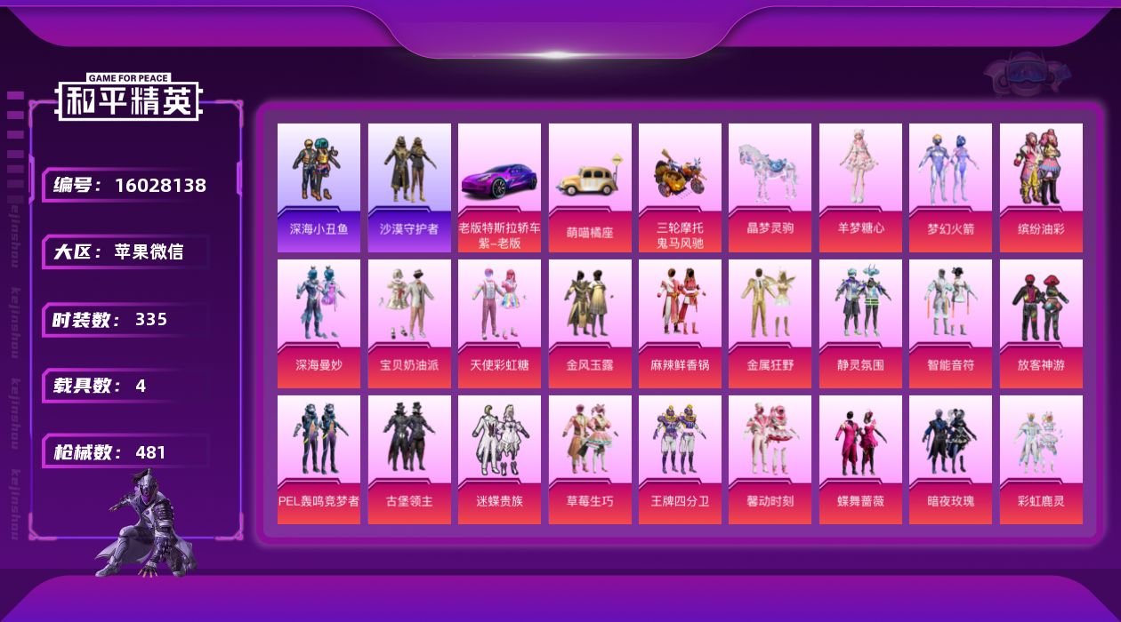 [16028138]【特价出售/店主推荐】苹果 微信-无敌战神框-35粉装-26特效枪-4载具-12粉色飞行器-19w热力值-31王牌印记-335套装-481枪皮 【热门品类】:粉装-梦幻火箭,粉装-缤纷油彩,套装-浪漫天命,套装-深海小丑鱼,套装-沙漠守护者,套装-龟仙人,套装-潮萌小黄鸭,套装-浪漫波比,套装-粉红小猪,角色-Mark.06 【粉色套装】:粉装-深海曼妙,粉装-宝贝奶油派,粉装-天使彩虹糖,粉装-梦幻火箭,粉装-金风玉露,粉装-麻辣鲜香锅,粉装-金属狂野,粉装-静灵氛围,粉装-智能音符,粉装-缤纷油彩,粉装-放客神游,粉装-PEL轰鸣竞梦者,粉装-古堡领主,粉装-迷蝶贵族,粉装-草莓生巧,粉装-王牌四分卫,粉装-馨动时刻,粉装-蝶舞蔷薇,粉装-暗夜玫瑰,粉装-彩虹鹿灵,粉装-黄伞悠悠,粉装-海渊国主,粉装-蓝莓炮弹,粉装-酣梦娃娃,粉装-筑梦精灵,粉装-旋转彩虹,粉装-冰川幽秘,粉装-寒光使者,粉装-飒粉甜心,粉装-未来歌姬,角色-茉莉星,粉装-蜜语绒猫,角色-美琪,粉装-桃粉嫣然,角色-羊梦糖心 【粉色枪皮等级】:AKM-炫紫旋律(四级),AKM-梦之光华(七级),SCAR-L-童趣迷兔(五级),SCAR-L-机甲封神(三级),M416-心之恋语(四级),M416-风花雪月(七级),GROZA-焦糖拿铁(五级),GROZA-镜光银凌(四级),AUG-星之彼岸(五级),M762-甜蜜誓约(六级),UMP45-恐龙拽拽(四级),UMP45-玉魂晶魄(八级),Vector-红伞翩翩(五级),汤姆逊-怪笑疯兔(五级),AKS-74U-星穹咏叹调(六级),P90-甜蜜草莓(五级),P90-魔童闹海 敖丙(三级),Kar98K-伏魔团(五级),Kar98K-巳巳如意(五级),Mini14-龙虾霸霸(七级),SLR-暗夜玫瑰(二级),S12K-海渊国主(五级),M249-蓝莓炮弹(五级),DP-28-豹影疾电(五级),MG3-洛神天依(五级),PKM-天星战神(四级) 【粉色载具】:特斯拉Model 3(奇幻紫),萌喵橘座,鬼马风驰,僚机-萌兔起飞,晶梦灵驹 【粉色枪皮】:AKM-炫紫旋律,AKM-梦之光华,SCAR-L-童趣迷兔,SCAR-L-机甲封神,M416-心之恋语,M416-风花雪月,GROZA-焦糖拿铁,GROZA-镜光银凌,AUG-星之彼岸,M762-甜蜜誓约,