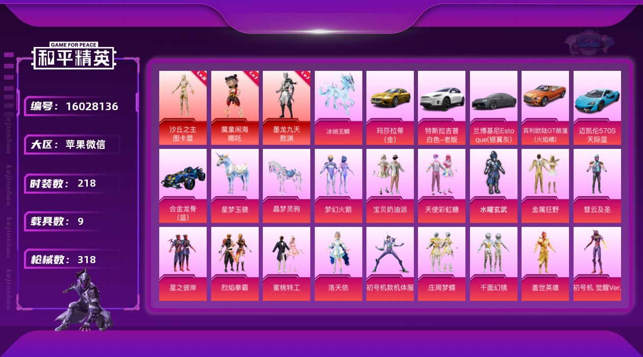- [15615786]【特价出售/店主推荐】苹果 微信-无敌战神框-1神装-26粉装-9特效枪-6载具-5粉色飞行器-100523热力值-9王牌印记-189套装-249枪皮 【红色载具】:路特斯EVIJA(电光紫)(六级) 【红色神装等级】:沙丘之主-图卡盟(一级) 【红色角色神装】:沙丘之主-图卡盟 【热门品类】:粉装-梦幻火箭,粉装-童趣迷兔,粉装-缤纷油彩,套装-浪漫天命,套装-冥河战士,套装-小丑鱼,角色-2B战斗服款,套装-龟仙人,套装-浪漫波比,角色-8号机 【粉色套装】:粉装-蝶舞迷情,粉装-精灵迷巫,粉装-梦幻火箭,粉装-缤纷油彩,粉装-甜蜜誓约,粉装-俏皮狐尾,粉装-苍蓝魅影,粉装-翡翠骑士,粉装-冰霜白皇,粉装-童趣迷兔,粉装-暗翼战神,粉装-彩虹鹿灵,粉装-山涧鹿灵,角色-洛天依,粉装-吟月归客,角色-零号机款机体服,角色-初号机款机体服,角色-2号机款机体服,粉装-流星咚咚,粉装-海盐物语,粉装-橘柚倾心,粉装-冷魅冰骑,粉装-紫电风暴,粉装-寒光使者,角色-小可学妹,角色-圣堂之誓 【粉色枪皮等级】:SCAR-L-梦幻火箭(七级),SCAR-L-锦绣绵绵(四级),M416-风花雪月(七级),GROZA-香水柠檬(五级),M762-甜蜜誓约(五级),UMP45-恐龙拽拽(五级),P90-沙丘之主(三级),Kar98K-巳巳如意(五级),平底锅-林间仙鹿(二级) 【粉色载具】:兰博基尼URUS(明艳黄),阿斯顿马丁DBS(红),路特斯EVIJA(电光紫),宾利欧陆GT敞篷(火焰橘),永恒黄蜂,Formula E Gen2(幽光蓝),空客H135-蔚蓝之翼 【粉色枪皮】:SCAR-L-梦幻火箭,SCAR-L-锦绣绵绵,M416-风花雪月,GROZA-香水柠檬,M762-甜蜜誓约,UMP45-恐龙拽拽,P90-沙丘之主,Kar98K-巳巳如意,平底锅-林间仙鹿 【粉色飞行器】:精灵迷巫飞行器,梦幻火箭飞行器,激战未来飞行器,暗翼战神飞行器,沙丘之主天马 【粉色降落伞】:百万伏特降落伞,精灵迷巫降落伞,梦幻火箭降落伞,金风玉露降落伞,神秘黑猫降落伞,古堡领主降落伞,繁花小夜曲降落伞,甜蜜誓约降落伞,阿狸红降落伞,香水柠檬降落伞,暗翼战神降落伞,林间仙鹿降落伞,绿意幻情降落伞,暗星紫秘降落伞,恐龙拽拽降落伞,冷魅冰骑降落伞,彩虹甜喵降落伞,第五大道降落伞,纯梦嫁纱降落伞,