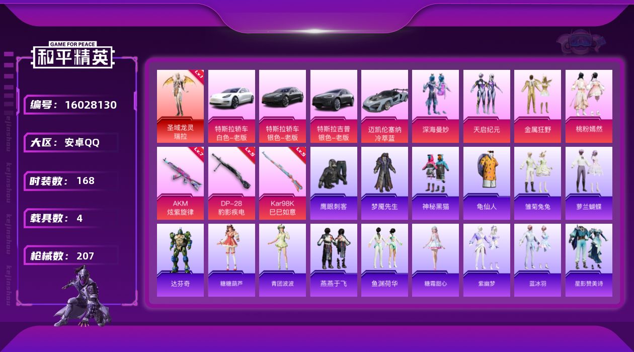 [16028130]【特价出售/店主推荐】安卓 手Q-1神装-4粉装-3特效枪-4载具-6粉色飞行器-7w热力值-9王牌印记-168套装-207枪皮【红色神装等级】:圣域龙灵-瑞拉(一级)【红色角色神装】:圣域龙灵-瑞拉【热门品类】:套装-龟仙人【粉色套装】:粉装-深海曼妙,粉装-天启纪元,粉装-金属狂野,粉装-桃粉嫣然【粉色枪皮等级】:AKM-炫紫旋律(七级),Kar98K-巳巳如意(五级),DP-28-豹影疾电(五级)【粉色载具】:特斯拉Model 3(珍珠白),特斯拉Model 3(冷光银),特斯拉Model X(冷光银),迈凯伦塞纳(冷萃蓝)【粉色枪皮】:AKM-炫紫旋律,Kar98K-巳巳如意,DP-28-豹影疾电【粉色飞行器】:深海曼妙飞行器,炫紫旋律飞行器,圣域金龙飞行器