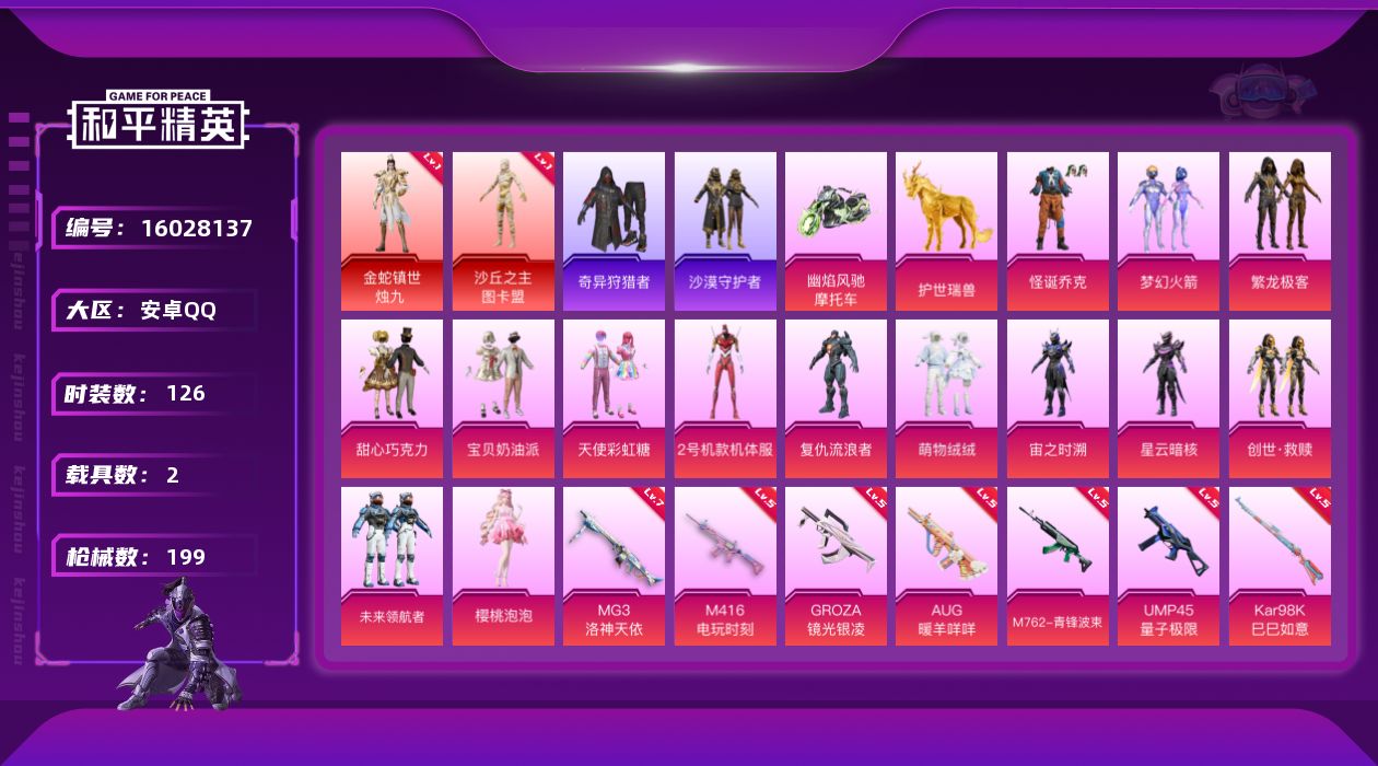 [16028137]【特价出售/店主推荐】安卓 手Q-2神装-14粉装-14特效枪-2载具-10粉色飞行器-6.8w热力值-9王牌印记-126套装-199枪皮