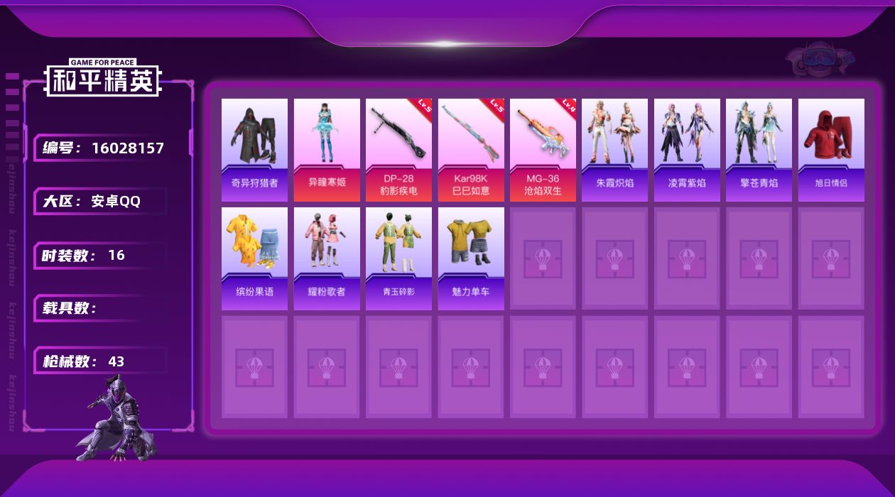 [16028157]安卓 手Q-1粉装-3特效枪-0载具-0粉色飞行器-10834热力值-1王牌印记-16套装-43枪皮 【热门品类】:套装-奇异狩猎者 【粉色套装】:角色-异瞳寒姬 【粉色枪皮等级】:Kar98K-巳巳如意(五级),DP-28-豹影疾电(五级),MG-36-沧焰双生(四级) 【粉色枪皮】:Kar98K-巳巳如意,DP-28-豹影疾电,MG-36-沧焰双生 【稀有套装】:套装-朱霞炽焰,套装-凌霄紫焰,套装-擎苍青焰 【稀有枪皮】:SCAR-L-炫彩节奏,SCAR-L-红色方程式,M416-蓝色火焰,QBZ-洛神天依,AC-VAL-天降萌叽,ACE32-钛晶裂爪,ARX-凌霄紫焰,UZI-天降萌叽,汤姆逊-天降萌叽,JS9-凌霄紫焰,P90-巳巳如意,M24-樱桃泡泡,SKS-炫彩节奏,AMR-喜羊羊与灰太狼,S12K-玩趣呆呆,DP-28-彩虹符号,MG3-幻世战舞者,MG-36-凌霄紫焰,P92-凌霄紫焰,爆炸猎弓-喜羊羊与灰太狼,撬棍-冷漠罗丽,平底锅-凌霄紫焰 【其他套装】:套装-旭日情侣,套装-缤纷果语,套装-耀粉歌者,套装-青玉碎影,套装-魅力单车,套装-奇异狩猎者 【营地ID】:998038778