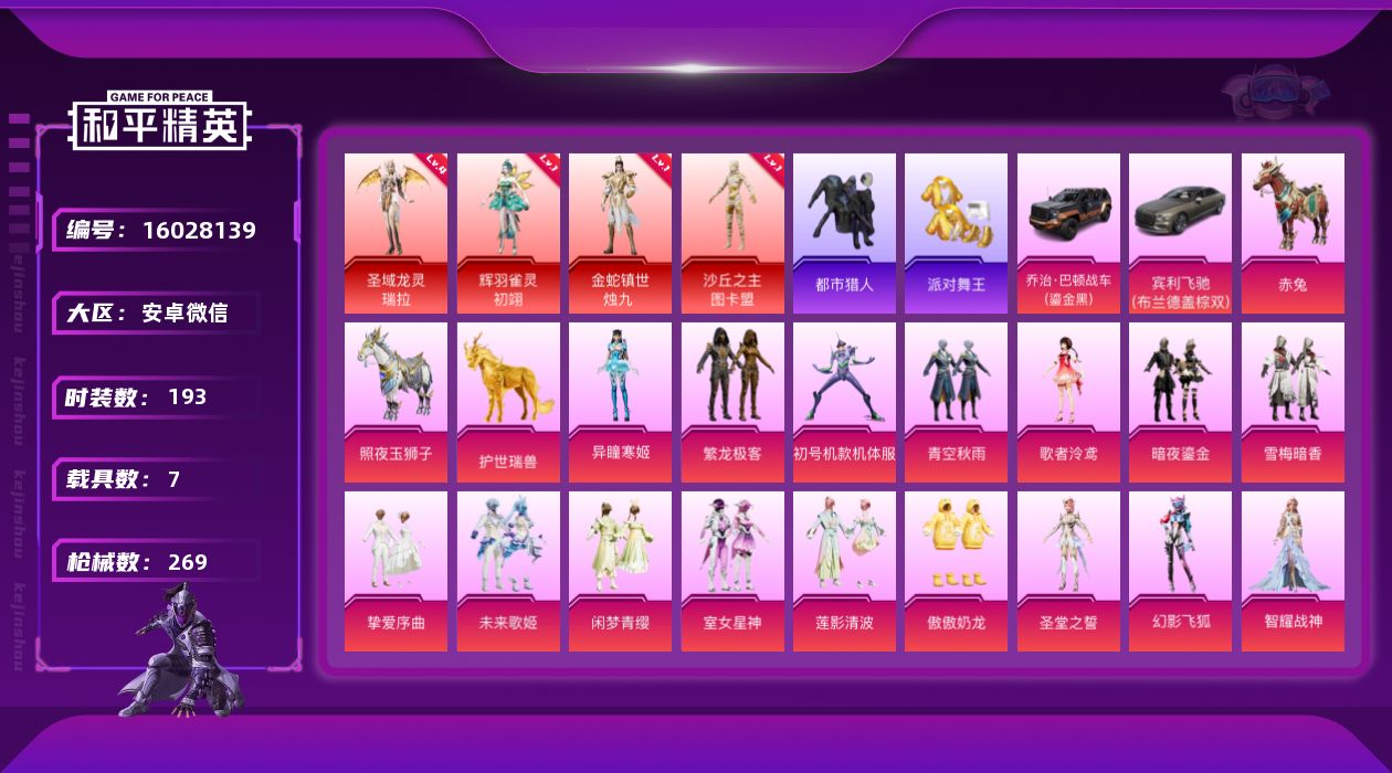 - PX_2083816- 安卓手Q-8王牌印记-18粉装-18特效枪-4载具-96935热力值-201套装-284枪皮-2卓越印记-1传奇印记 【18粉装】,雪国幻梦,梦幻火箭,宝贝奶油派,缤纷油彩,放客神游,怪诞乔克,幻彩电音,狂魅哈莉,千金淑猫,复仇流浪者,小可学妹,蜜语绒猫,美雪,萨利娅,冰川幽秘,星梦奇缘,金丰海韵,幻影战神 【18特效枪】AKM-白勺歌姬-1级 AKM-幽焰骑士-3级 SC
