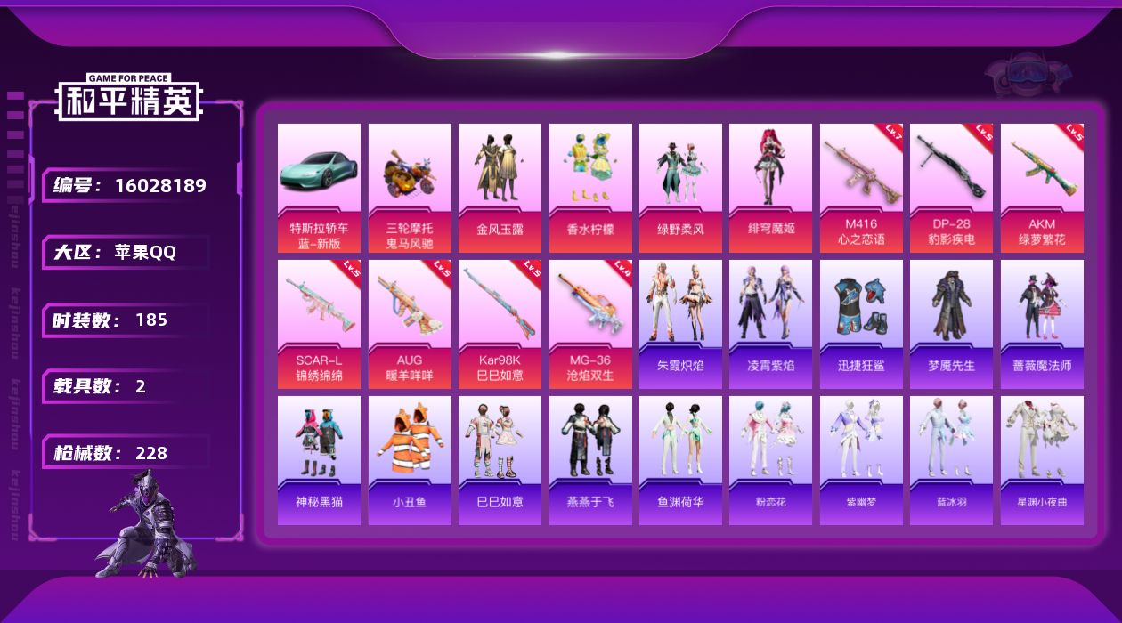 [16028189]【特价出售/店主推荐】苹果 手Q-4粉装-7特效枪-2载具-0粉色飞行器-68360热力值-7王牌印记-185套装-228枪皮