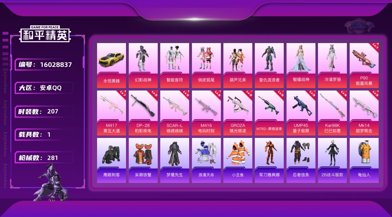 - [16448882]安卓 手Q-8粉装-8特效枪-2载具-6粉色飞行器-99217热力值-23王牌印记-219套装-317枪皮 【热门品类】:套装-浪漫天命,套装-都市猎人,套装-深海小丑鱼,角色-忠真马岱,角色-忠义严颜,套装-暗夜之虎,套装-龟仙人,套装-暗影哥特,角色-8号机,角色-Mark.06,大砍刀-青龙偃月刀,撬棍-龙胆亮银枪 【粉色套装】:粉装-幻影战神,粉装-银河战甲,粉装-冷魅冰骑,粉装-紫电风暴,角色-白勺歌姬,角色-初号机 觉醒Ver.,角色-萨利娅,角色-绯穹魔姬 【粉色枪皮等级】:M416-心之恋语(七级),AUG-许七安(七级),UMP45-量子极限(五级),Kar98K-巳巳如意(五级),AMR-智耀战神(五级),DBS-幻影飞狐(五级),DP-28-豹影疾电(五级),破片手榴弹-瓶中星球(七级) 【粉色载具】:合金龙骨(绿),拉轰奶龙龙 【粉色枪皮】:M416-心之恋语,AUG-许七安,UMP45-量子极限,Kar98K-巳巳如意,AMR-智耀战神,DBS-幻影飞狐,DP-28-豹影疾电,破片手榴弹-瓶中星球 【粉色飞行器】:闪光银龙飞行器,黄族统领飞行器,镜域双华-灵镜之阶,龙翔九天飞行器,万象金身飞行器 【粉色降落伞】:幻影战神降落伞,银河战甲降落伞,甜蜜誓约降落伞,暗夜玫瑰降落伞,恐龙拽拽降落伞,庄周梦蝶降落伞,筑梦精灵降落伞,炙焰牛王降落伞,垂柳戏鸭降落伞,花傲天降落伞,镜域双华降落伞,初号机 觉醒Ver.降落伞,BEARBRICK降落伞,千金淑猫降落伞,鬼刀降落伞,星穹咏叹调降落伞,幻彩电音降落伞,绯穹魔姬降落伞,异瞳寒姬降落伞,炫彩糖果降落伞 【稀有套装】:套装-龟仙人,套装-巳巳如意,套装-雪国风尚,套装-雏菊兔兔,套装-萝兰蝴蝶,套装-小熊娃娃,角色-狂花道·娜可露露,套装-糖糖葫芦,套装-青团波波,角色-都市丽猫,套装-燕燕于飞,套装-鱼渊荷华,角色-风玲,角色-海琴烟,套装-晶辉守护,套装-粉恋花,套装-紫幽梦,套装-蓝冰羽,套装-星影赞美诗,套装-引力深渊,套装-极速光影,角色-绯色魅影,套装-书海巡游,套装-画境星梦,套装-琴音绮想 【稀有枪皮】:AKM-夜灯,AKM-彩虹符号,AKM-影袭,AKM-灼热熔岩,AKM-王牌投手,AKM-环太平洋,AKM-百万伏特,AKM-筑梦精灵,AKM-萌趣颜团子,AKM-虎虎生威,AKM-