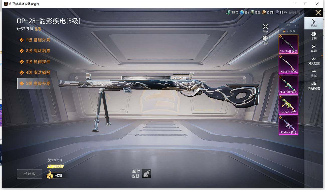 【粉色枪皮等级】:AKM-绿萝繁花(五级),SCAR-L-梦幻火箭(七级),UMP45-恐龙拽拽(七级),Kar98K-巳巳如意(五级),DP-28-豹影疾电(五级)