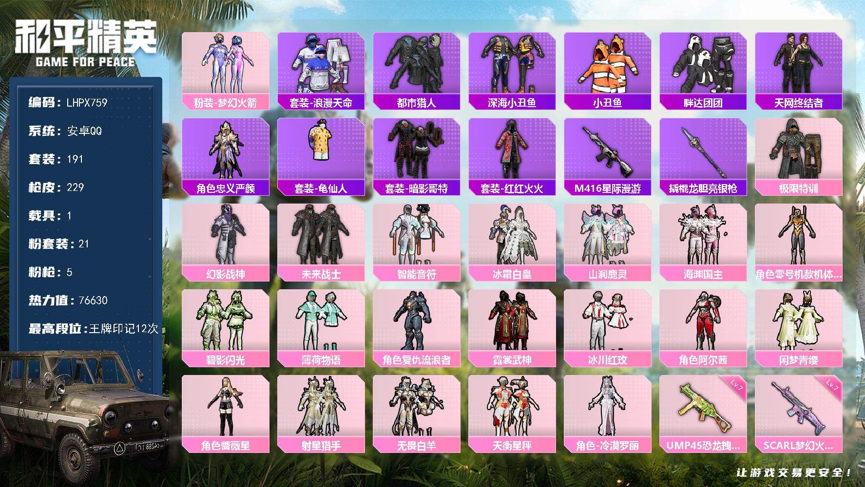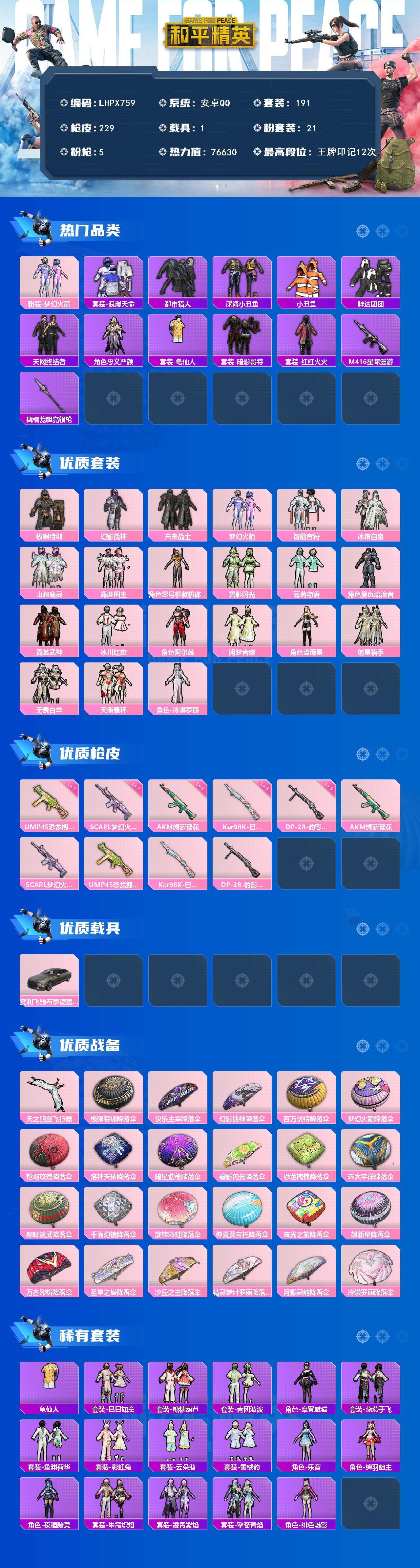 - [16330614]【店主推荐捡漏号!可直接换绑】安卓 手Q-2粉装-5特效枪-0载具-1粉色飞行器-50076热力值-8王牌印记-131套装-170枪皮 【热门品类】:套装-浪漫天命,套装-龟仙人 【粉色套装】:套装-创世·救赎,角色-绯穹魔姬 【粉色枪皮等级】:AUG-暖羊咩咩(五级),UMP45-量子极限(五级),P90-金丰海韵(七级),Kar98K-巳巳如意(五级),DP-28-豹影疾电(五级) 【粉色枪皮】:AUG-暖羊咩咩,UMP45-量子极限,P90-金丰海韵,Kar98K-巳巳如意,DP-28-豹影疾电 【粉色降落伞】:洛神天依降落伞,音爆索尼克降落伞,第五大道降落伞,创世·救赎降落伞,临安公主降落伞,月影灵韵降落伞,樱桃泡泡降落伞,荧海星豚降落伞,异瞳寒姬降落伞,炫彩糖果降落伞 【稀有套装】:套装-龟仙人,套装-绒宝小鹅,套装-雪国风尚,角色-临安公主,套装-燕燕于飞,套装-鱼渊荷华,套装-霓虹热舞,套装-朱霞炽焰,套装-凌霄紫焰,套装-擎苍青焰,角色-紫俏灵猫,套装-画境星梦,套装-琴音绮想,套装-炫彩糖果 【稀有枪皮】:AKM-彩虹符号,AKM-破晓战魂,AKM-虎虎生威,AKM-龙的传人,M16A4-幻世战舞者,M16A4-红色方程式,M16A4-蓝色火焰,SCAR-L-夜灯,SCAR-L-玉兔迎春,SCAR-L-红色方程式,SCAR-L-小狗蛇点点,M416-糯团青竹,M416-红色方程式,M416-绯红前夜,M416-蓝色火焰,GROZA-彩虹符号,GROZA-田园牧歌,AUG-天降萌叽,AUG-耀粉歌者,QBZ-彩虹符号,M762-天降萌叽,M762-彩虹符号,M762-绯红前夜,M762-萌物绒绒,AC-VAL-天降萌叽,蜜獾-垂柳戏鸭,蜜獾-天降萌叽,ACE32-画境星梦,ARX-凌霄紫焰,UZI-啾咪啾咪,UZI-天降萌叽,UZI-炫彩节奏,UZI-红色方程式,UMP45-夜灯,UMP45-炫光之旅,UMP45-生命誓言,UMP45-蓝色火焰,Vector-生命誓言,Vector-田园牧歌,汤姆逊-天降萌叽,汤姆逊-炫彩节奏,汤姆逊-耀粉歌者,MP5K-画境星梦,JS9-凌霄紫焰,Kar98K-彩虹符号,Kar98K-洛神天依,Kar98K-红色方程式,SKS-金玉无双,VSS-彩虹符号,VSS-田园牧歌,VSS-绿野极光,Mini14-旋转彩虹